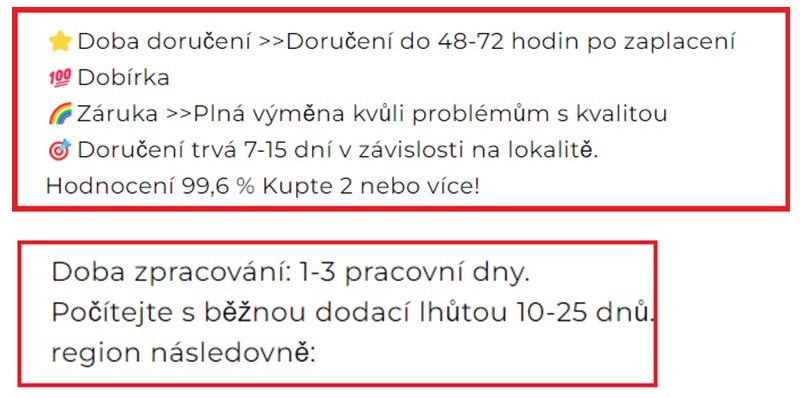 5. Doprava a platba: Dříve podvodné e-shopy neumožňovaly platbu na dobírku. Někteří podvodníci ale platbu dobírkou bohužel umožňují, a dokonce sami na svých stránkách varují před podvodnými praktikami, což zvyšuje dojem důvěryhodnosti. Zákazníkům ale většinou zašlou produkt, který vizuálně a kvalitativně vůbec neodpovídá realitě. Bedlivě tedy čtěte i informace o dopravě a platbě. Ty často bývají nesrozumitelné a nejsou v nich uvedeni ani konkrétní přepravci pro Českou republiku.