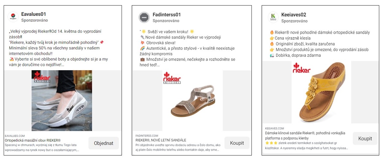 7. Reklamy na sociálních sítích: Podvodníci inzerují své “produkty” i na sociálních sítích. Pokud vás nějaká reklama na boty či doplňky zaujme, podívejte se na název prodejce. Ten bývá často pro češtinu krkolomný, jako například Keeiaeeves02 apod. Pokud reklamu i tak rozkliknete, podívejte se na URL adresu. Ověřené e-shopy mají jednoduchou adresu s koncovkou. cz. Podvodné e-shopy mají často URL adresu se zahraniční koncovkou. Dejte si načas a podezřelý web si pořádně projděte, včetně kontaktních údajů a obchodních podmínek. Jedině tak budete mít jistotu, že nejste na stránkách podvodníků.