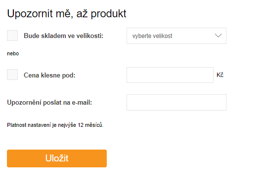 Nebo si můžete nastavit hlídacího psa nejen na sledování konkrétního produktu a jeho velikosti, ale také na sledování poklesu ceny na vámi zadanou částku. Jakmile hlídacího psa nastavíte, na uvedený e-mail vám zašleme notifikaci ihned, jakmile velikost opět doskladníme, nebo cena produktu klesne na vámi zadanou částku.