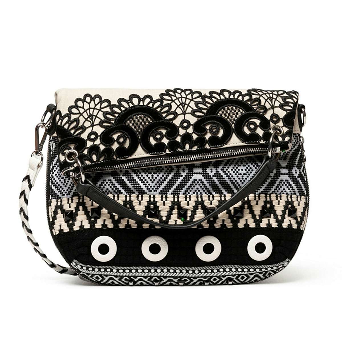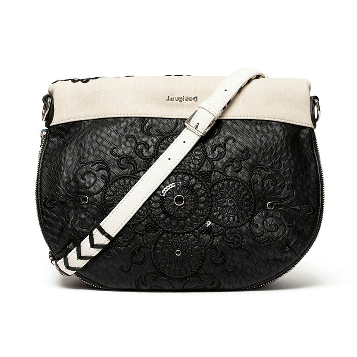 Praktická kabelka Desigual s ohýbatelnou vrchní částí, díky níž si můžete kabelku velikostně zmenšit a stejně tak, i její objem praktickým podélným zipem. Svrchní materiál je vyroben kombinací materiálů a různými zdobícími technikami.