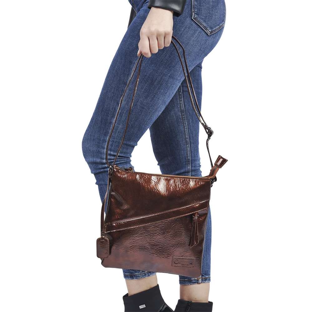 Kabelka značky REMONTE – jedná se o vyšší řadu značky Rieker, která bude Vaším společníkem na každý den. Cross body je vyrobena z kvalitního materiálu, má délkově nastavitelný ramenní popruh a zip na vrchní a vnější straně. Lesklý svršek je doplněný logem značky a ozdobou na popruhu. Tento model se bude hodit ke každému outfitu, který si vezmete. Kabelka je dostatečně prostorná, kde se Vám vleze smartphone, peněženka, nebo i knížka. Rozměry: cca V 26 cm x Š 25,5 cm Vnitřní uspořádání: kabelka je dělená Kabelka má délkově nastavitelný popruh