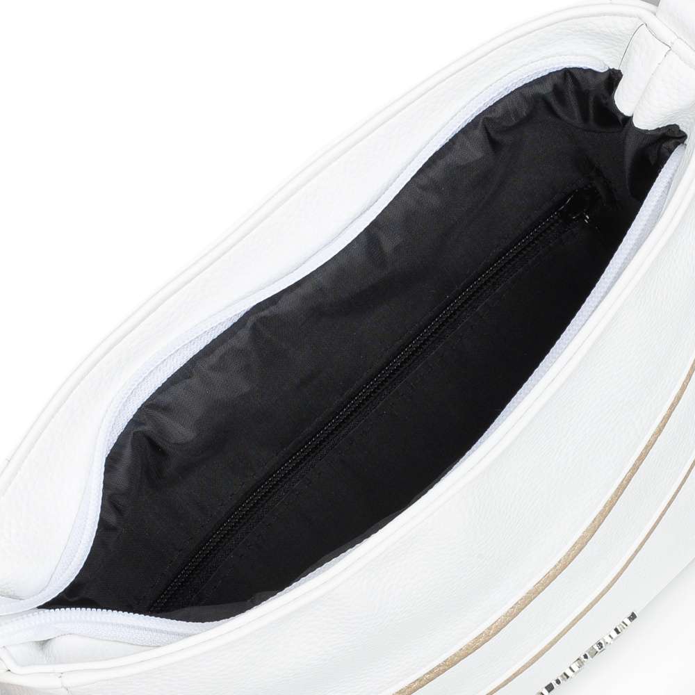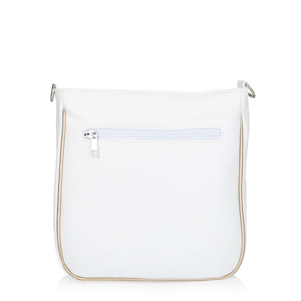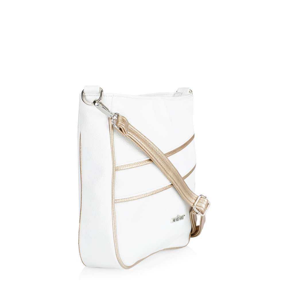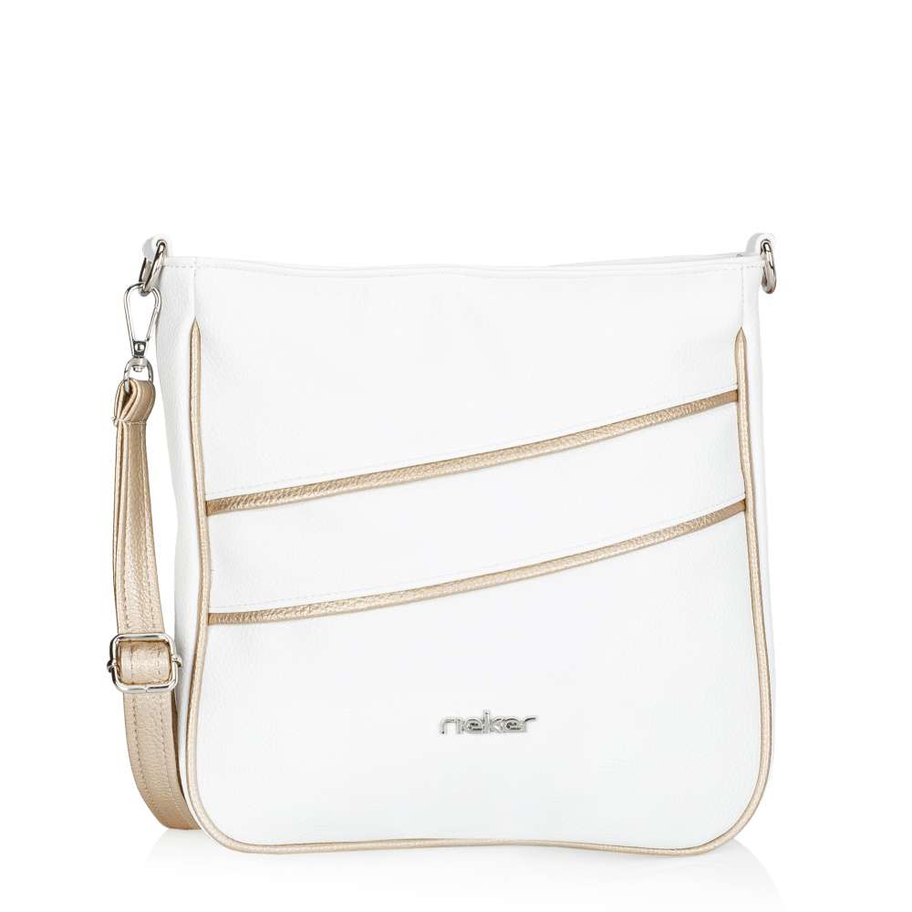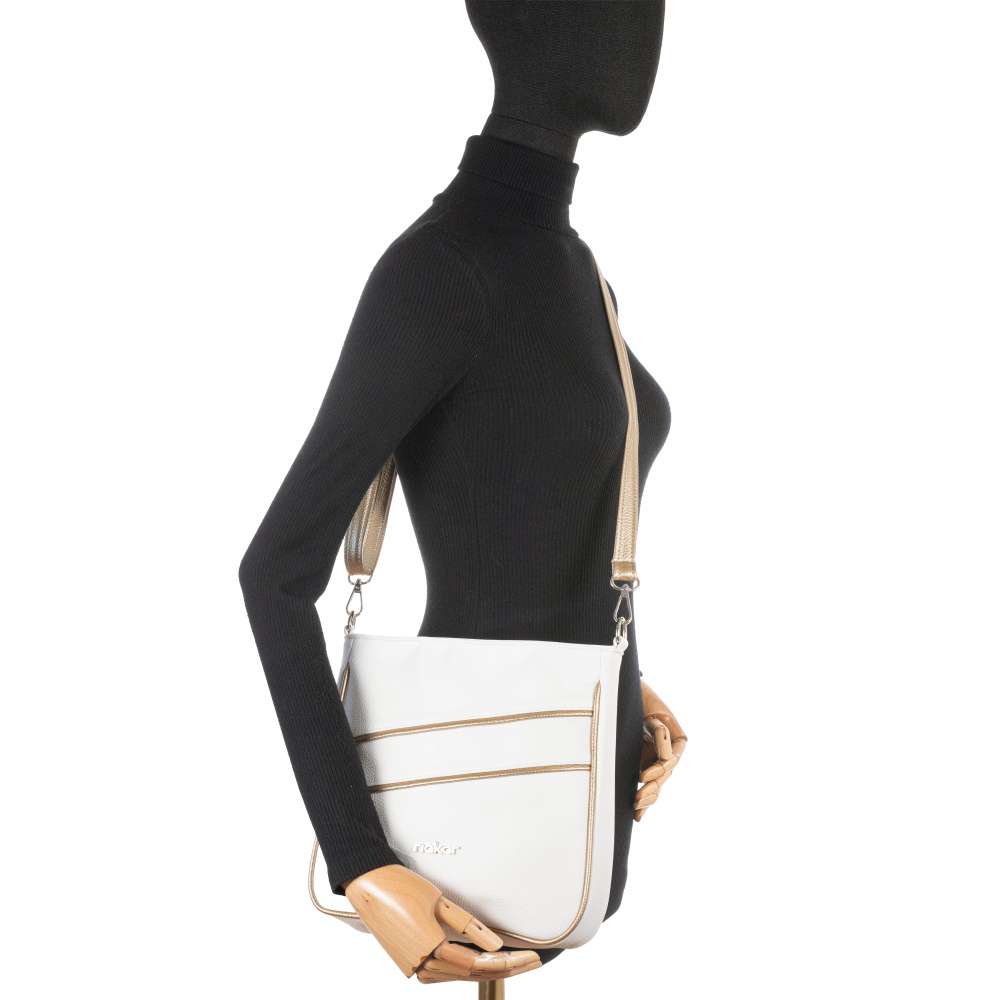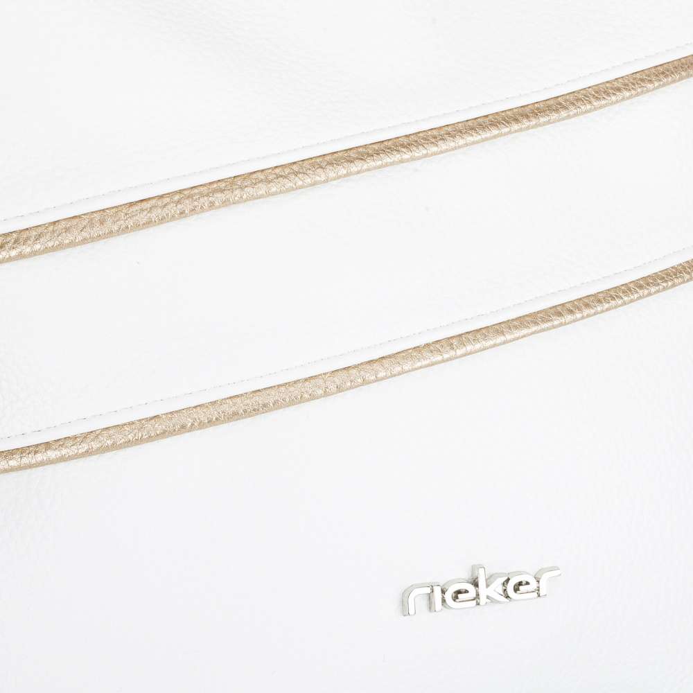 Kabelka RIEKER v bílém provedení okouzlí na první pohled svými půvabnými liniemi s jemnými odlesky zlaté barvy, které jí dodávají nádech luxusu. Logo značky stříbrné barvy dodá punc originality. Je to doplněk, který dokáže krásně rozzářit každý outfit a dodat mu svěží, stylový charakter. Tato kabelka však není jen krásná - je také mimořádně praktická. Nabízí dostatek prostoru a promyšlené detaily, které z ní dělají spolehlivého společníka pro každý den. Na zadní straně se nachází malá praktická kapsička, ideální na drobnosti, které chcete mít vždy rychle po ruce. Hlavní prostor je bezpečně uzavíratelný vrchním zipem a uvnitř ukrývá dvě menší kapsy, které pomáhají udržet vaše věci přehledně uspořádané. Kabelka je navíc vybavena odepínatelným popruhem s jemnými zlatými odlesky, jehož délku si můžete snadno přizpůsobit podle svých potřeb – pohodlně přes rameno nebo stylově přes tělo. Tato kabelka dokonale pojí módní vzhled s praktičností. Díky svým decentním detailům a promyšlenému prostoru se snadno stane vaším oblíbeným doplňkem, po kterém sáhnete každý den.