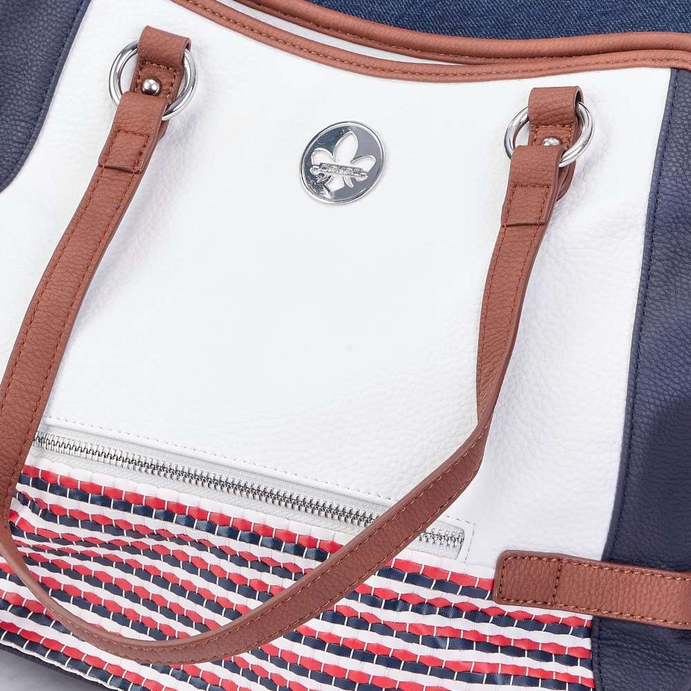 Detailní informace Tato trendy kabelka značky Rieker by neměla chybět v šatníku žádné ženy, která si oblibuje námořnický vzor. Hladký členitý svršek v námořnických barvách je ve své horní části doplněn o logo Rieker. Ve spodní části je taška ozvláštněna proplétanou strukturou červené a modré barvy, která je oddělena funkčním zipem, za kterým se nachází malá kapsička na drobnosti. Ta se nachází i na její zadní části. Horní část je uzavíratelná zipem, po jehož rozepnutí můžete vidět dvě velké hlavní kapsy. Uvnitř kabelky je všita krásná vzorovaná podšívka, která skvěle doplňuje její celkový vzhled. Má dvě velké uši, které mohou sloužit buď k nošení přes rameno, anebo i v ruce, které jsou v přední části zdobeny kovanými kruhy. Tato taška Vám díky svému vzhledu bude vhodným společníkem jak do práce, tak při procházkách městem, či na dovolenu k moři.
