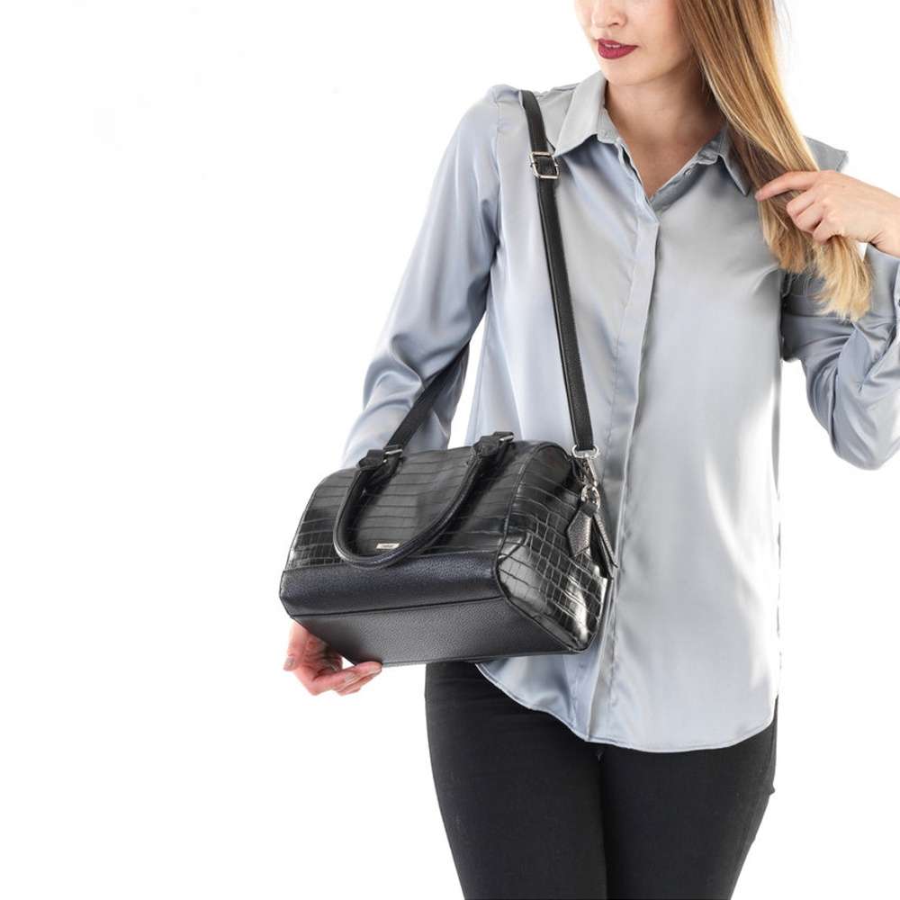 Originální a zároveň elegantní je tento vzor menší dámské kabelky značky RIEKER. Lesklý svršek je zdobný svým vzhledem hadí kůže a malým logem značky. U horního okraje má taška zip, po jehož rozepnutí se otevře vnitřní kapsa, do které se vleze snad vše, co potřebujete mít u sebe. Kabelku můžete nosit v ruce nebo přes rameno díky odepínatelnému nastavitelnému popruhu. Tento model bude ideální společník do práce nebo na večírek. Rozměry: cca v 26 cm x š 24 cm Vnitřní uspořádání: kabelka není dělená. Kabelka má délkově nastavitelný popruh, který lze odepnout.