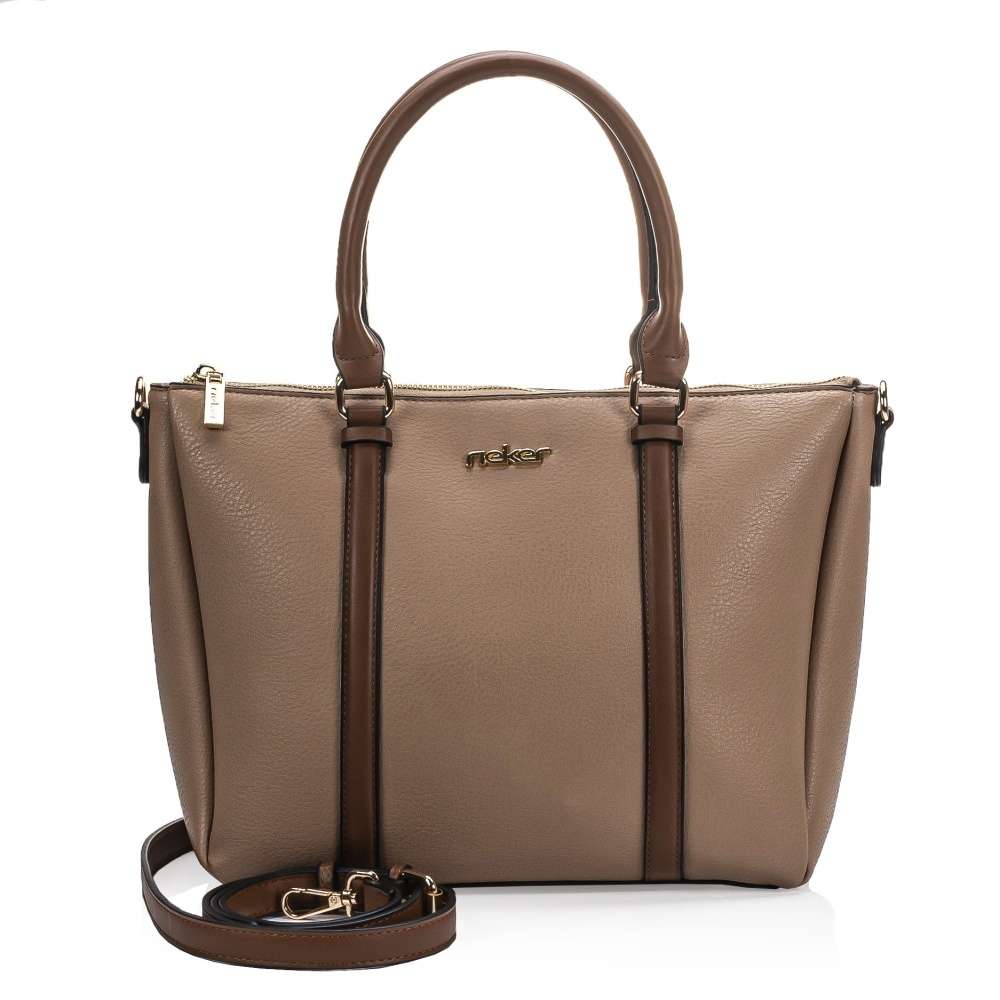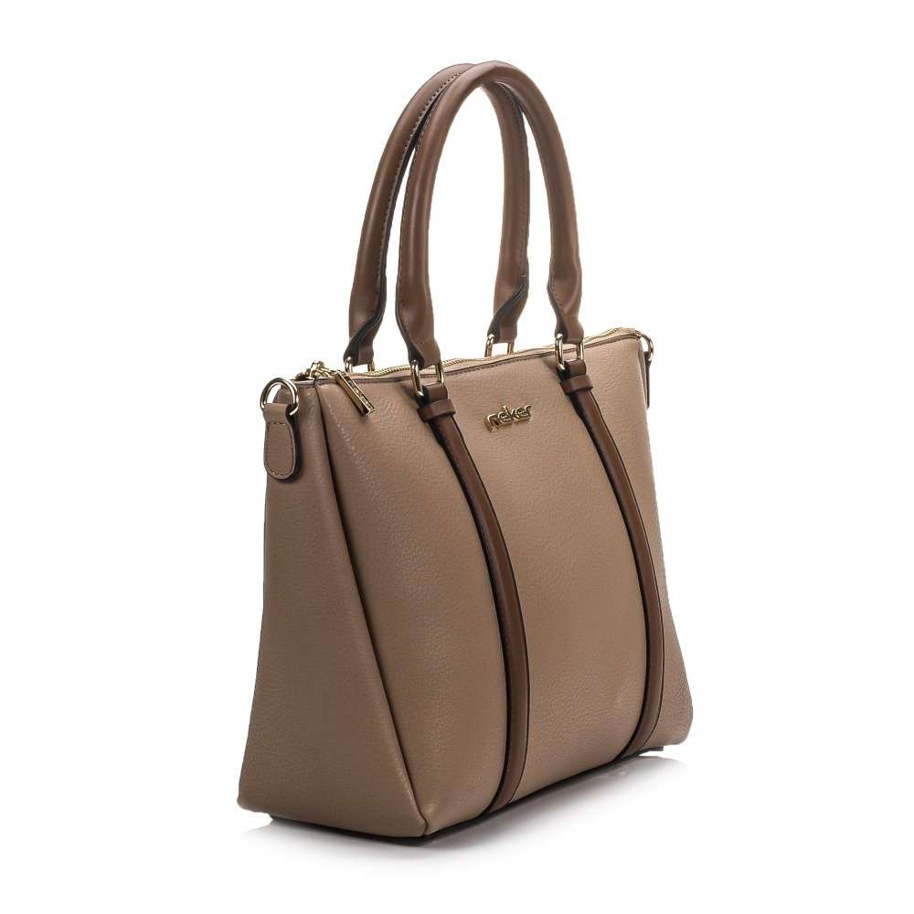 Detailní informace Tato módní dámská kabelka značky RIEKER Vás zaujme svou elegantností. Svršek ve světle hnědé barvě je ozdoben vystouplými kontrastními pruhy a zlatavými detaily, které dotváří dokonalý vzhled. Ze zadní strany Vás jistě potěší malá kapsička pro drobnosti. Taška se uzavírá zipem, po jehož rozepnutí naleznete několik dalších kapes například pro Váš mobil a klíče. Má dvě ucha, ale také širší ramenní popruh, který si můžete nastavit na Vámi zvolenou délku či jej odepnout. Poslouží Vám jako skvělý doplněk do města na nakupování s kamarádkou.