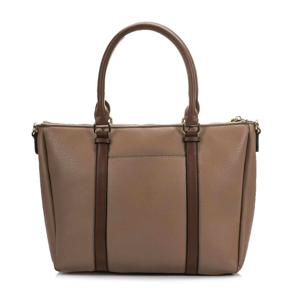 Tato módní dámská kabelka značky RIEKER Vás zaujme svou elegantností. Svršek ve světle hnědé barvě je ozdoben vystouplými kontrastními pruhy a zlatavými detaily, které dotváří dokonalý vzhled. Ze zadní strany Vás jistě potěší malá kapsička pro drobnosti. Taška se uzavírá zipem, po jehož rozepnutí naleznete několik dalších kapes například pro Váš mobil a klíče. Má dvě ucha, ale také širší ramenní popruh, který si můžete nastavit na Vámi zvolenou délku či jej odepnout. Poslouží Vám jako skvělý doplněk do města na nakupování s kamarádkou. Rozměry: cca v 26 cm x š 37 cm Vnitřní uspořádání: kabelka není dělená Kabelka má délkově nastavitelný popruh, který lze odepnout.
