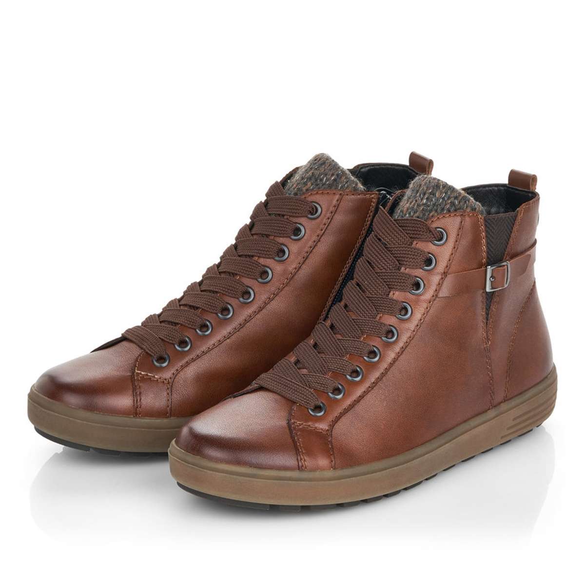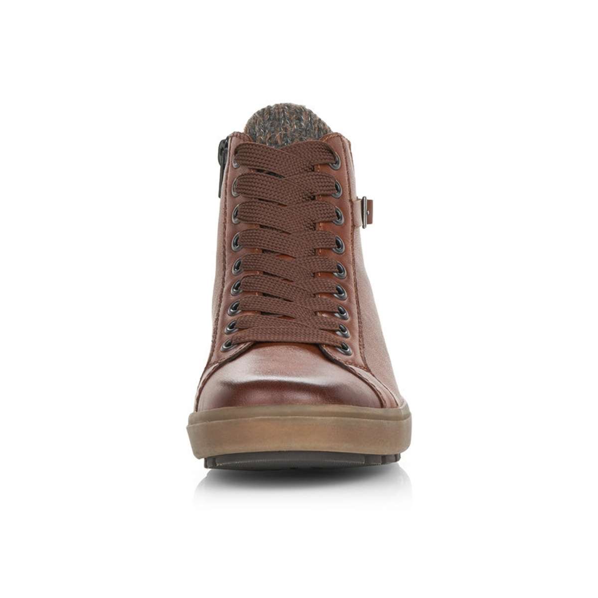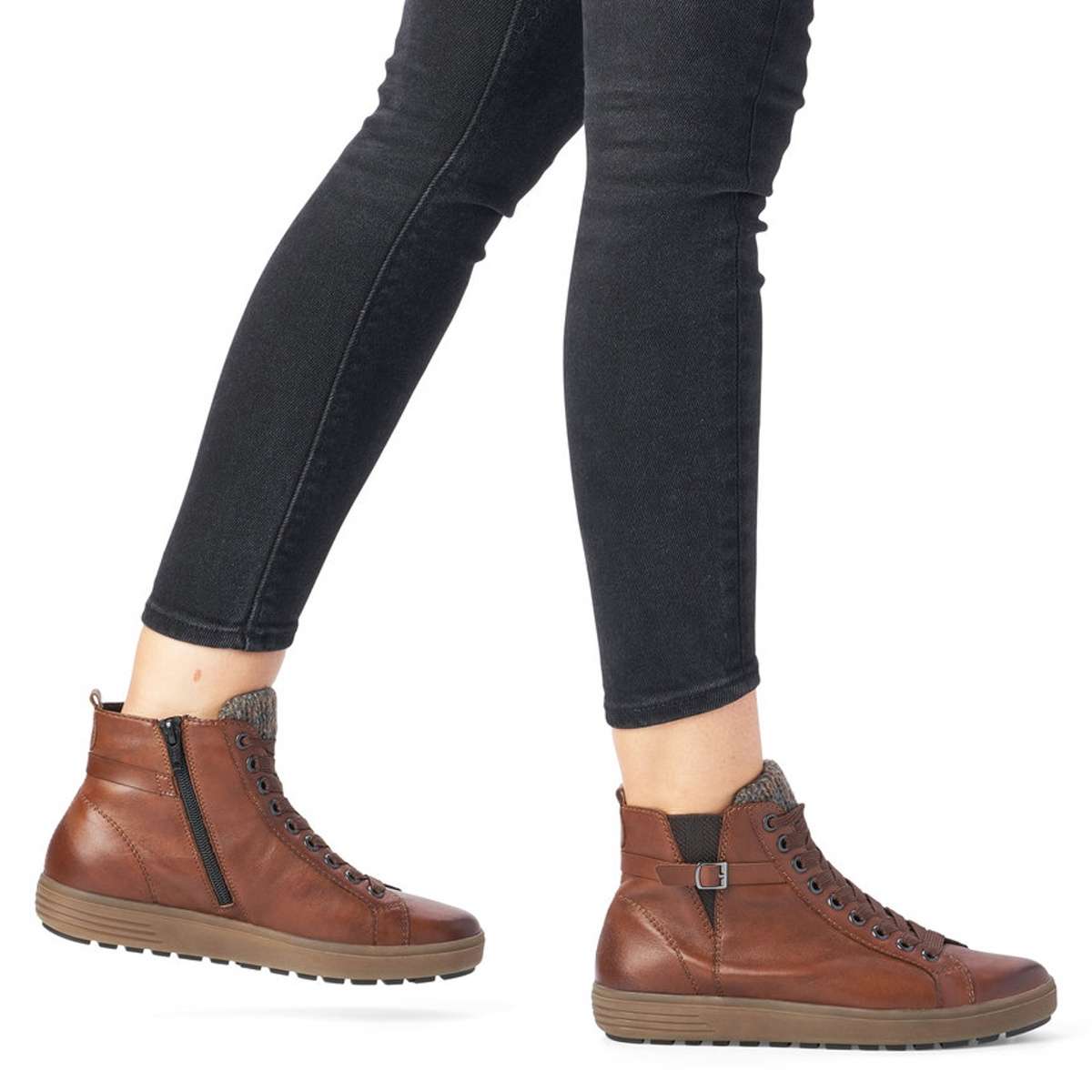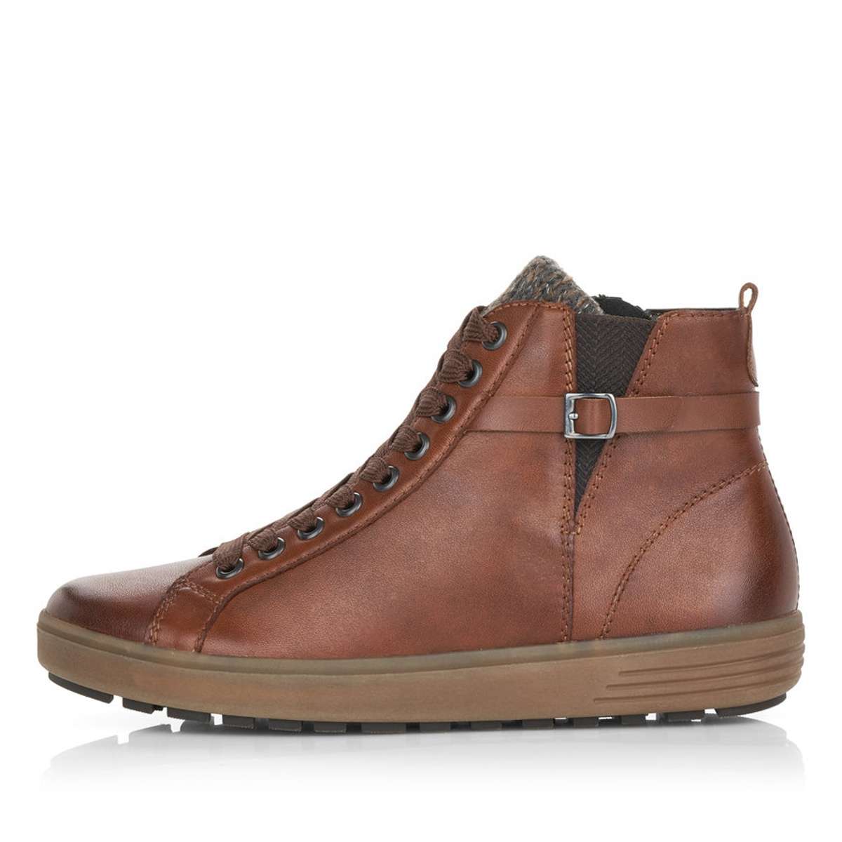 Dámské kotníkové tenisky značky REMONTE (vyšší řada značky Rieker) s pletenou ozdobou na jazyku. Svršek z vnější strany zdobí pásek s přezkou a gumička. Pro snadnější obouvání slouží kromě gumičky také šněrování a funkční zip na vnitřní straně. Tato obuv je vybavena vyjímatelnou stélkou, která je vyrobena z unikátní paměťové pěny, a proto se maximálně přizpůsobí tvaru Vašeho chodidla. Pevná podešev vysoká cca 3 cm a měkká stélka Vám zaručí pohodlí po celý den.