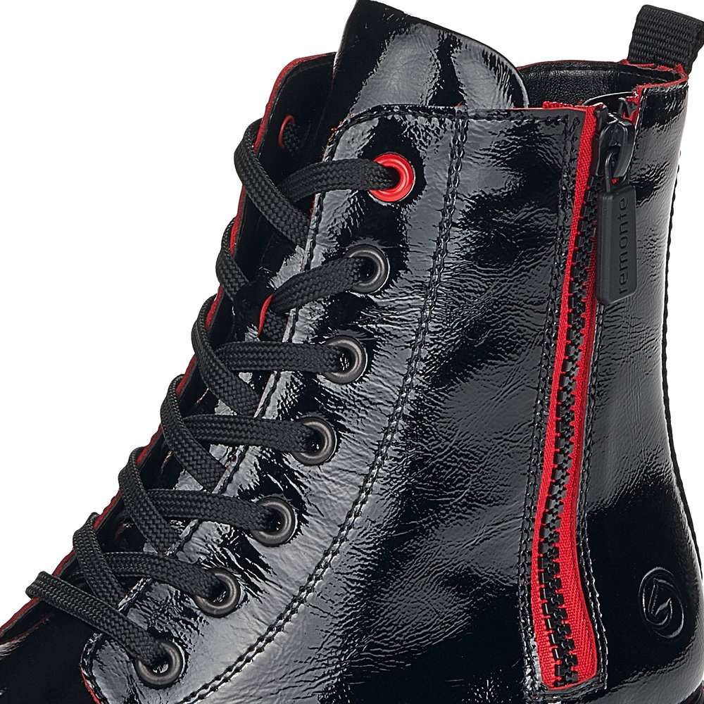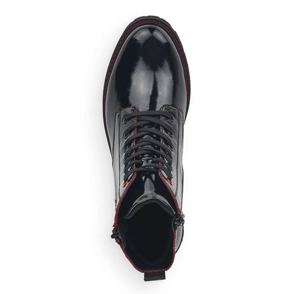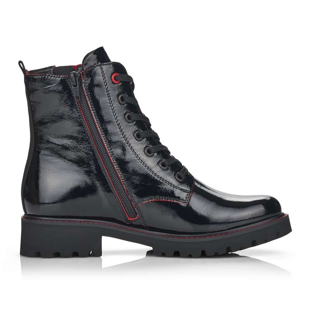 Černý lesklý svršek je ozdoben výrazným červeným lemováním šitých spojů, zipu a podešve. Snadno si obuv nazujete a přizpůsobíte dle požadavků díky funkčnímu zipu na vnitřní straně a šněrování.