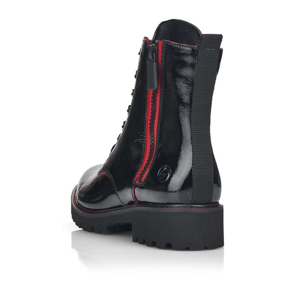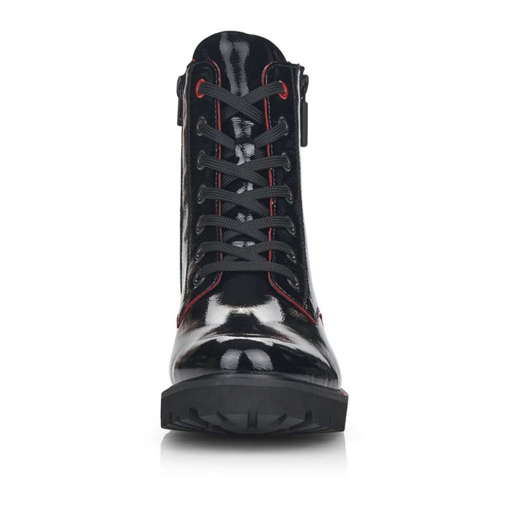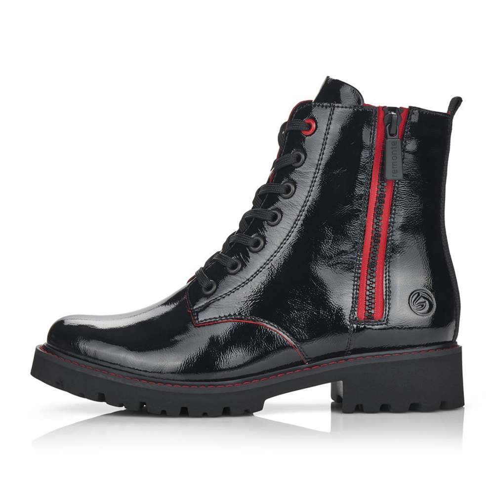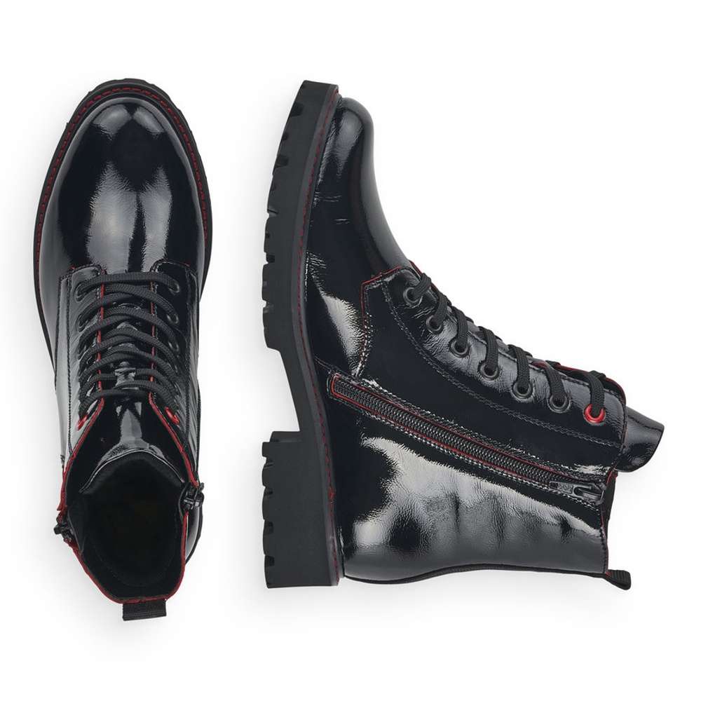 Černý lesklý svršek je ozdoben výrazným červeným lemováním šitých spojů, zipu a podešve. Snadno si obuv nazujete a přizpůsobíte dle požadavků díky funkčnímu zipu na vnitřní straně a šněrování.