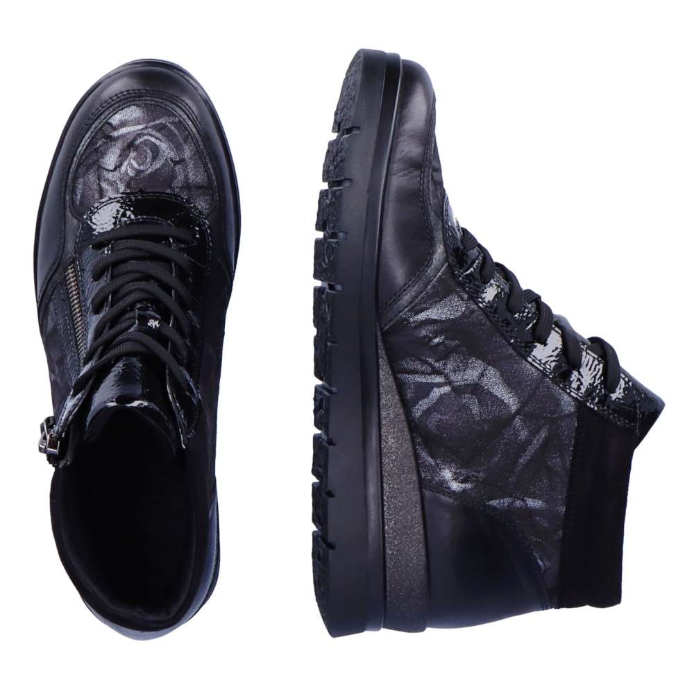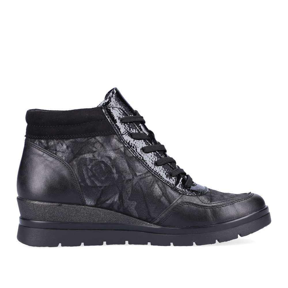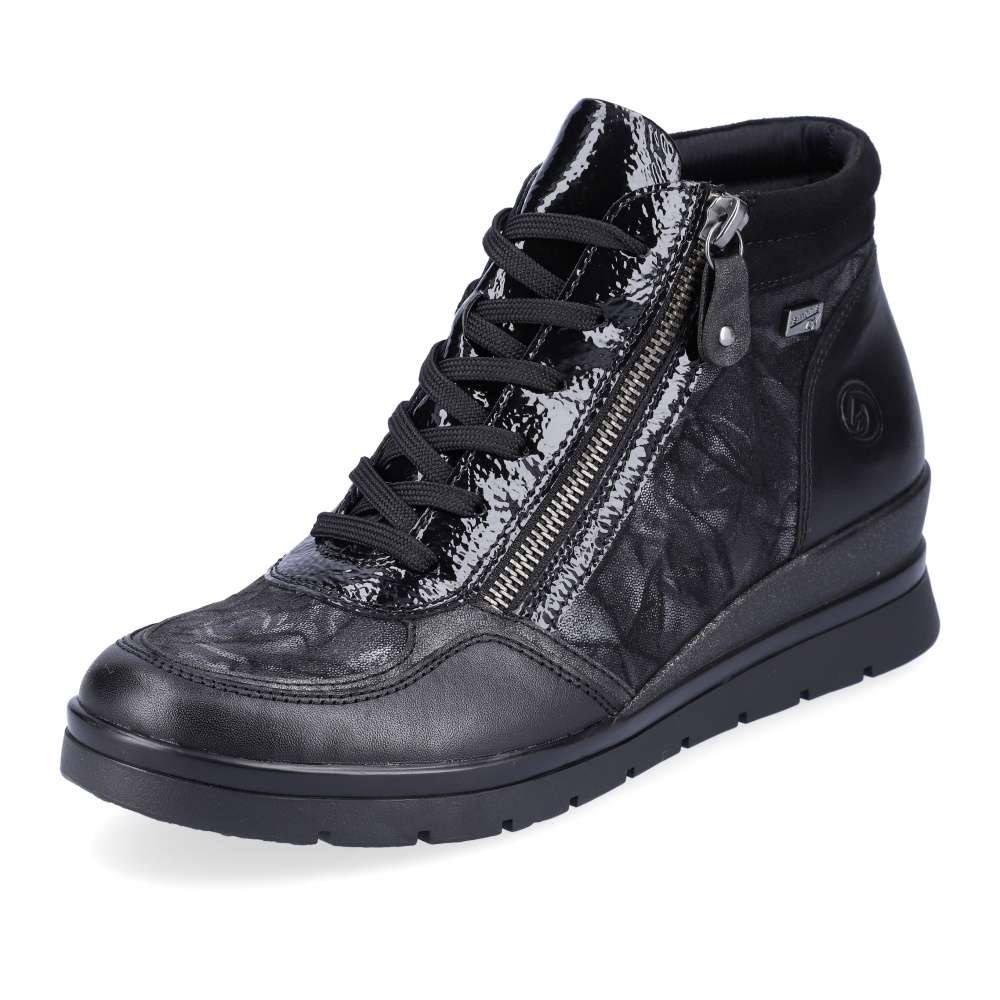 Obuv REMONTE je vyšší řadou značky RIEKER, obuv se vyznačuje kvalitou použitých materiálů. Pokud chcete oživit svůj zimní outfit, tak tento kotníkový model s technologií Remonte Tex je tou správnou volbou. Kožený svršek v kombinaci lesku a mramorového vzoru s kovovým zipem všitým podél šněrování je doplněn kontrastním lemováním kolem kotníku. Pro lepší obutí mají všitý funkční zip z vnitřní strany a o maximální komfort se postará měkká vyjímatelná stélka. Podešev, která připomíná platformu vysokou 4,5cm doladí celkový vzhled obuvi k dokonalosti. Boty z řady Remonte Vám zajistí maximální komfort a pohodlí při celodenním nošení. Technologie: Remonte TEX-funkční vrstva, díky které je bota nepromokavá a přesto prodyšná Tato bota je vybavena měkkou vyjímatelnou stélkou.
