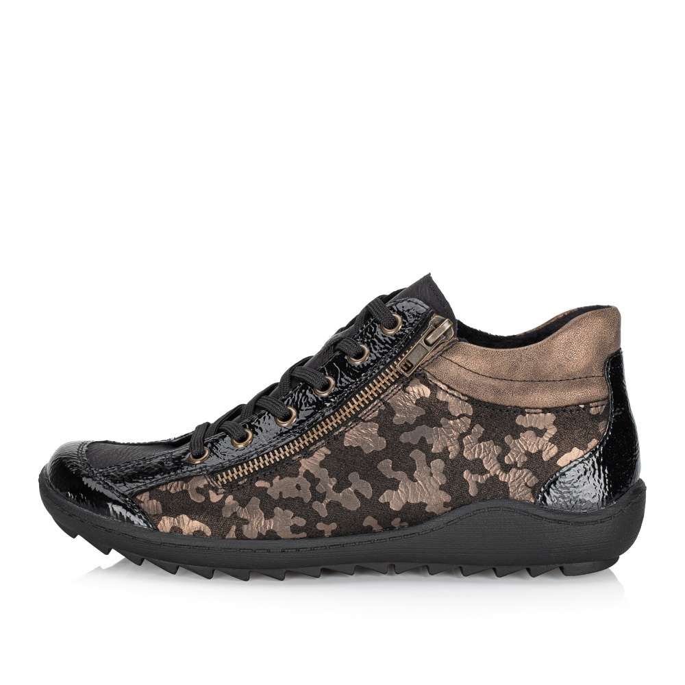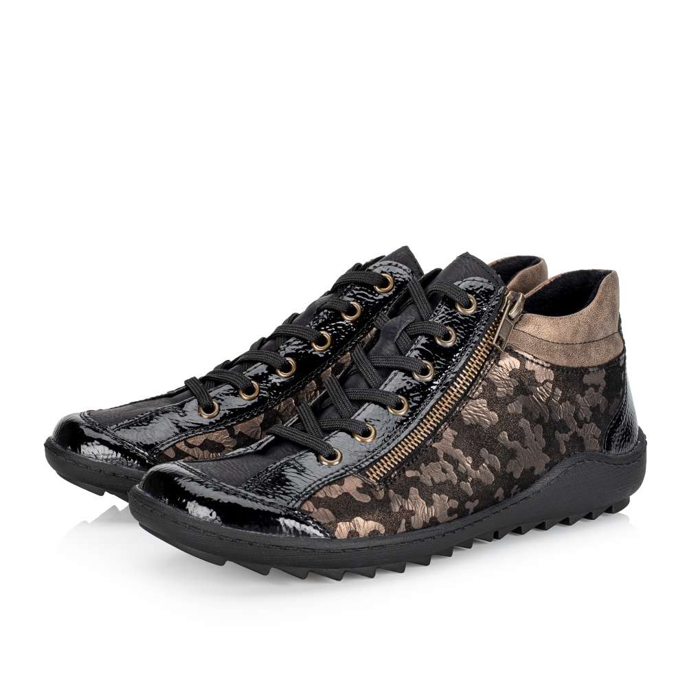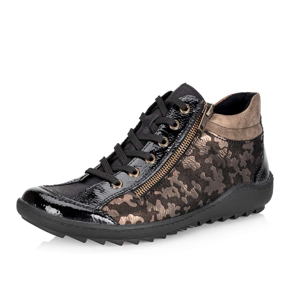 Obuv REMONTE – jedná se o vyšší řadu značky RIEKER, tato obuv se vyznačuje vynikající kombinací svrchních materiálů. Svršek těchto bot je vyroben spojením lesklého a designově potištěného materiálu. Kotníky si rychle nazujete díky postrannímu zipu a dokonale si upravíte dle svých požadavků díky šněrování. Pohodlí na každém kroku pocítíte díky jemně zateplené podšívce, vyjímatelné stélce a podešvi s hrubším vzorkem. Tento model bude Vaším vynikajícím parťákem na zimních procházkách městem. Technologie: Remonte Soft – unikátní stélka vyrobená z prodyšného materiálu, která svým tvarem a materiálem zajistí pocit pohodlí při celodenním nošení. Tato bota je vybavena vyjímatelnou stélkou.