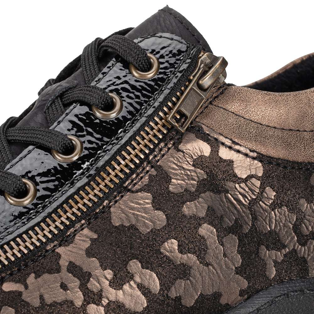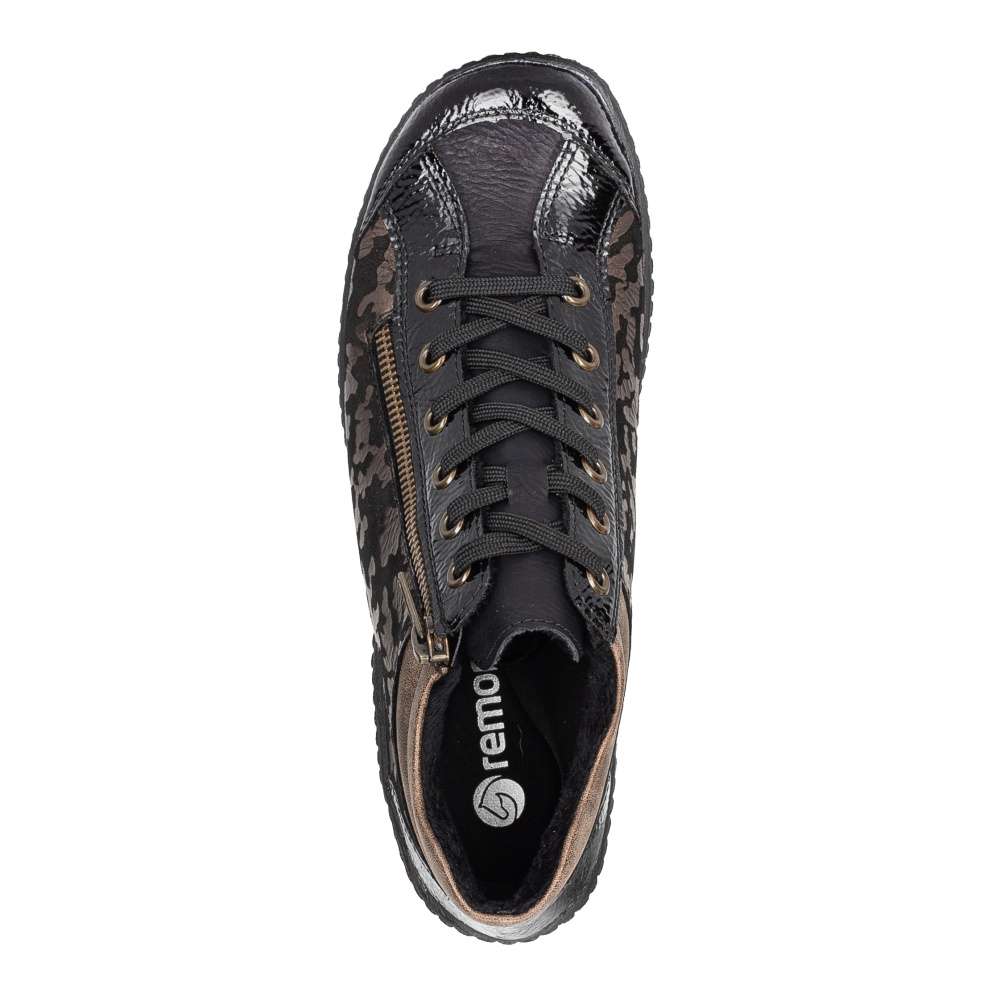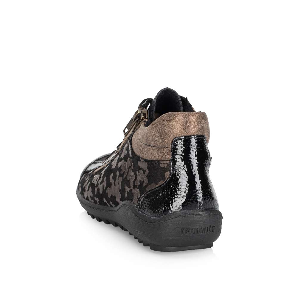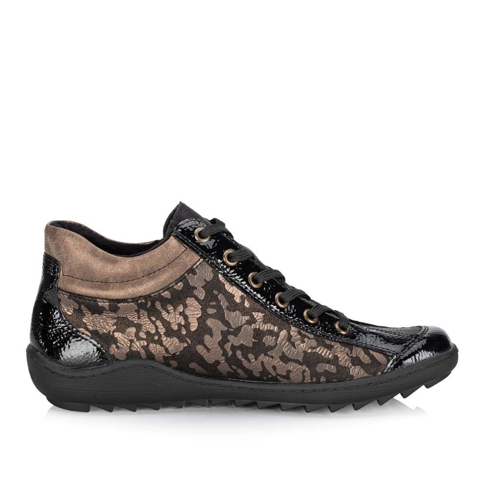 Obuv REMONTE – jedná se o vyšší řadu značky RIEKER, tato obuv se vyznačuje vynikající kombinací svrchních materiálů. Svršek těchto bot je vyroben spojením lesklého a designově potištěného materiálu. Kotníky si rychle nazujete díky postrannímu zipu a dokonale si upravíte dle svých požadavků díky šněrování. Pohodlí na každém kroku pocítíte díky jemně zateplené podšívce, vyjímatelné stélce a podešvi s hrubším vzorkem. Tento model bude Vaším vynikajícím parťákem na zimních procházkách městem. Technologie: Remonte Soft – unikátní stélka vyrobená z prodyšného materiálu, která svým tvarem a materiálem zajistí pocit pohodlí při celodenním nošení. Tato bota je vybavena vyjímatelnou stélkou.