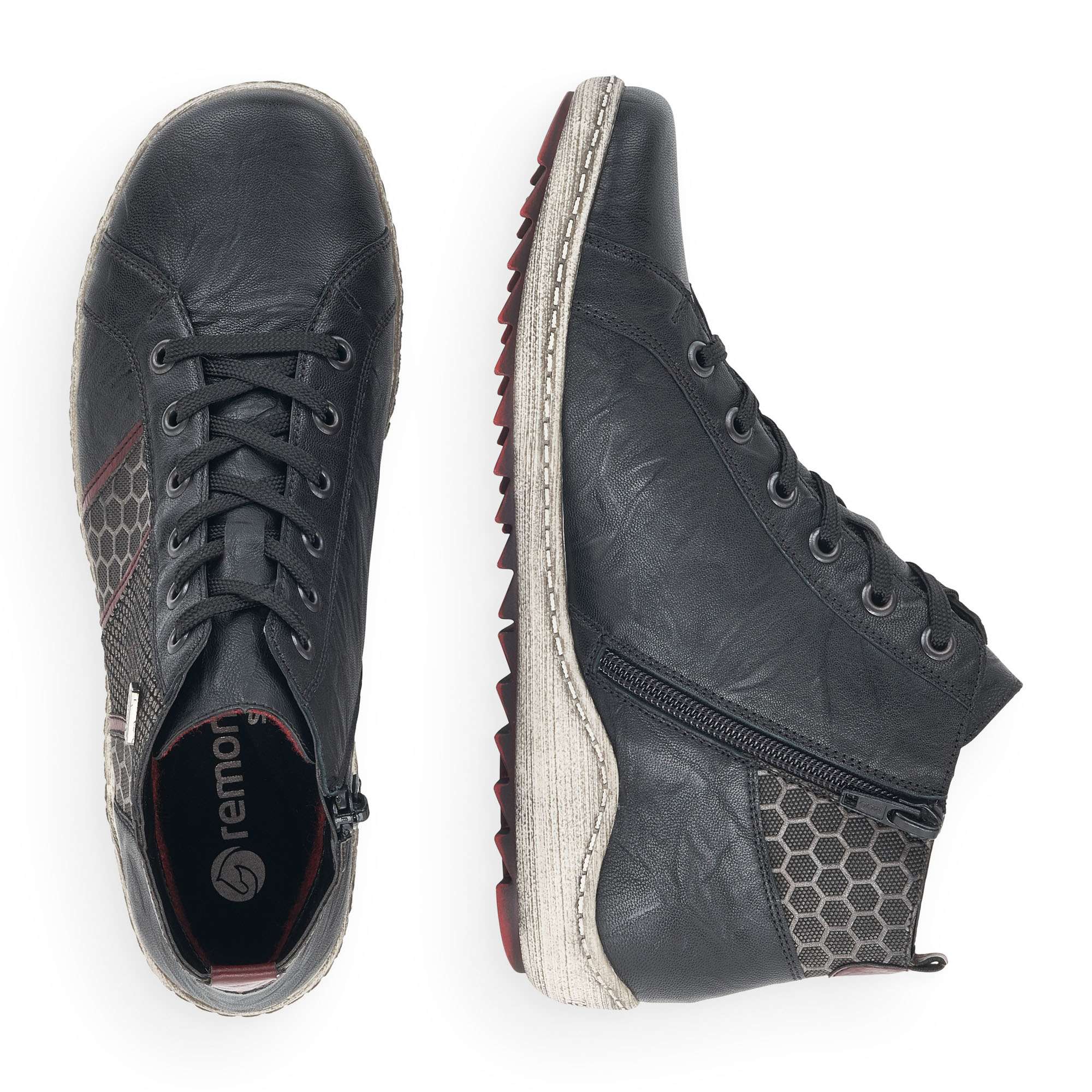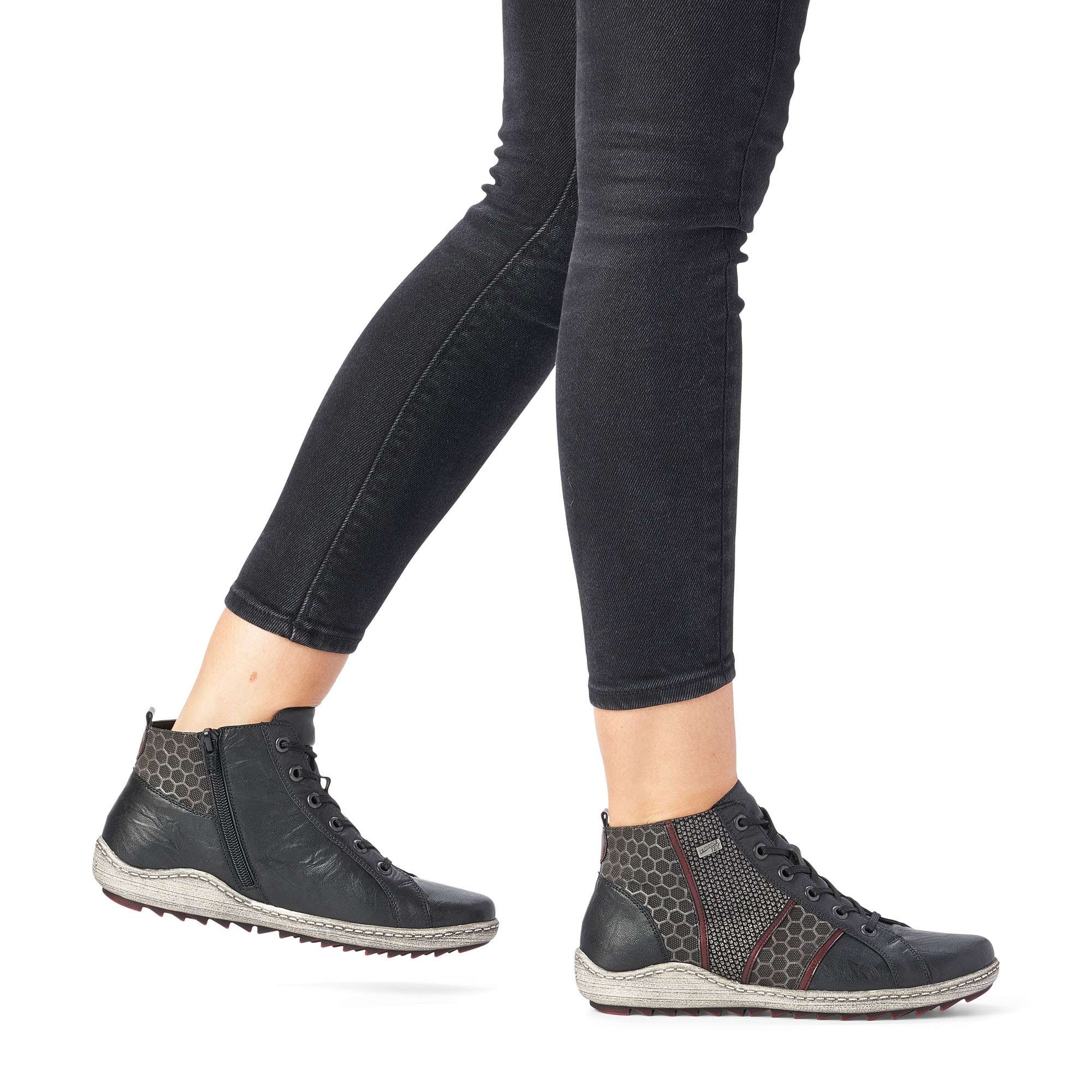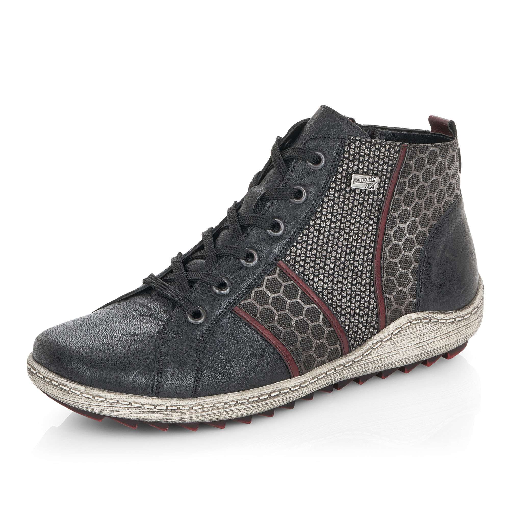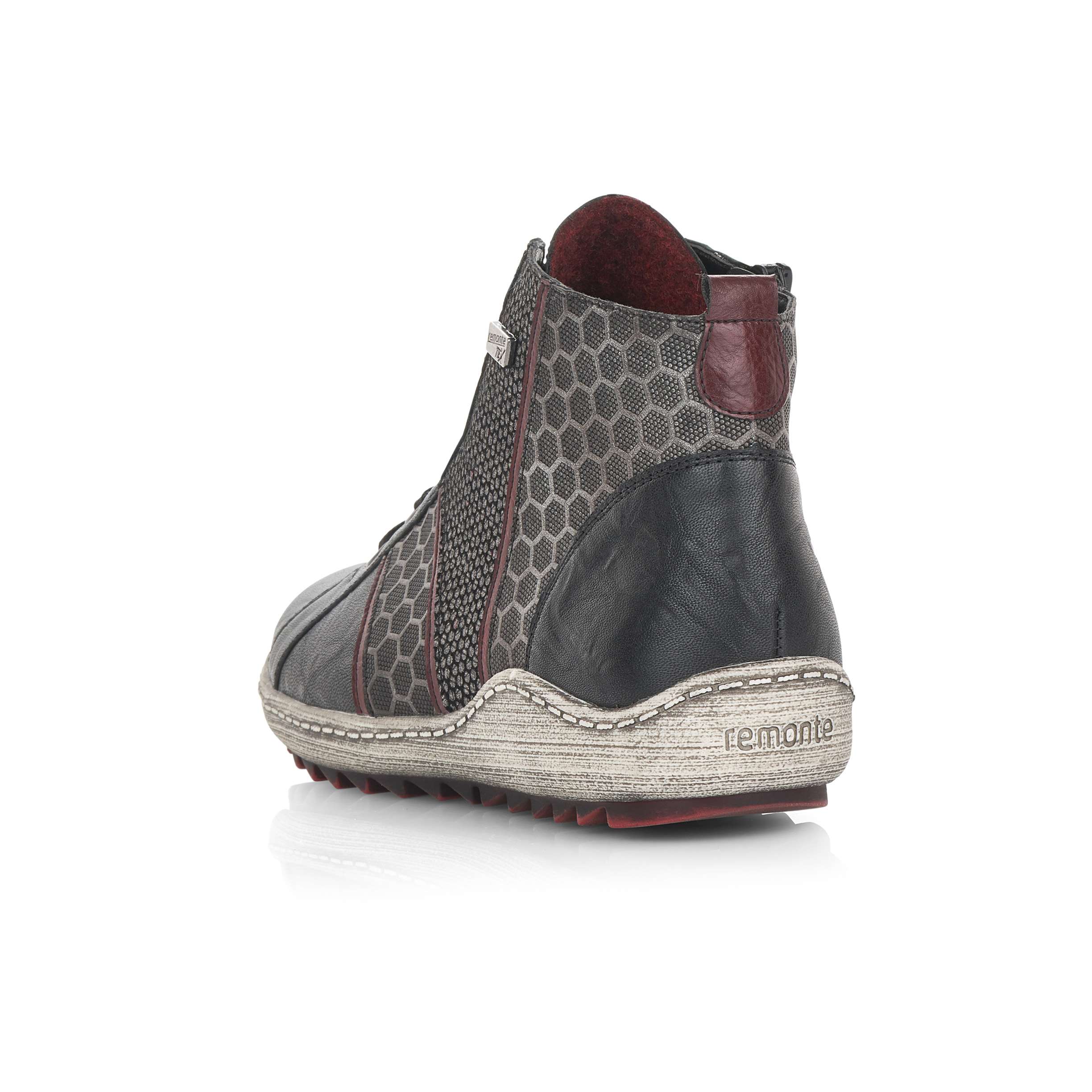 Dámská kotníková obuv šitá z pravé kůže doplněná kvalitními syntetickými prvky, značky REMONTE (jedná se o vyšší řadu značky RIEKER).