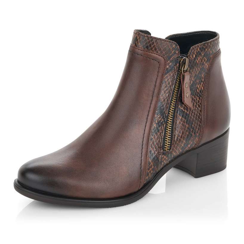 Tato dámská kotníková obuv je šitá z pravé kůže a doplněná kvalitními syntetickými prvky. Hladký hnědý svršek je ozdoben v oblasti kotníku hadím vzorem a nazouvání Vám usnadní funkční zipy. Boty z řady Remonte Vám zajistí maximální komfort a pohodlí při celodenním nošení. Tyto kotníky budou skvěle doplňovat Vaše outfity na každodenní nošení.