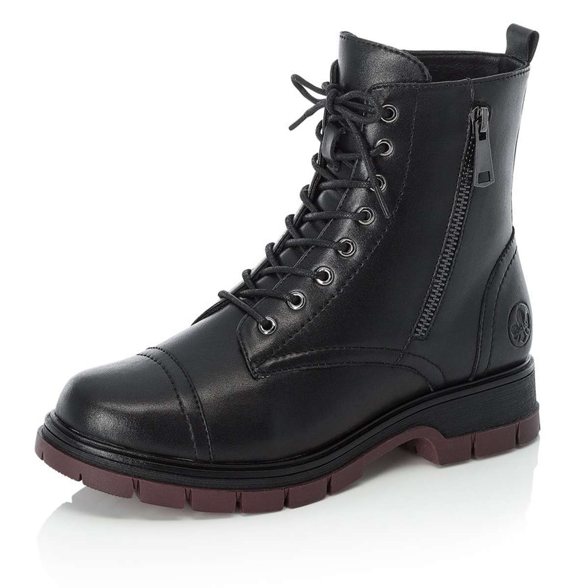 Nádherné kotníkové boty značky RIEKER, které mají vytláčené ozdobné logo na vnější straně a kontrastní podešev. Obouvání Vám usnadní šněrování, které poslouží pro lepší přizpůsobení na Vaši nohu. Uvnitř naleznete zateplenou podšívku, ta je zárukou maximálního pohodlí a tepla po celý den. Pevná podešev jemně traktorového vzoru v patě vysoká cca 3,6 cm má technologii Antistress, která je flexibilní a tlumí nárazy při došlapu. Tento kousek dodá šmrnc podzimním a zimním barvám Vašeho outfitu.
