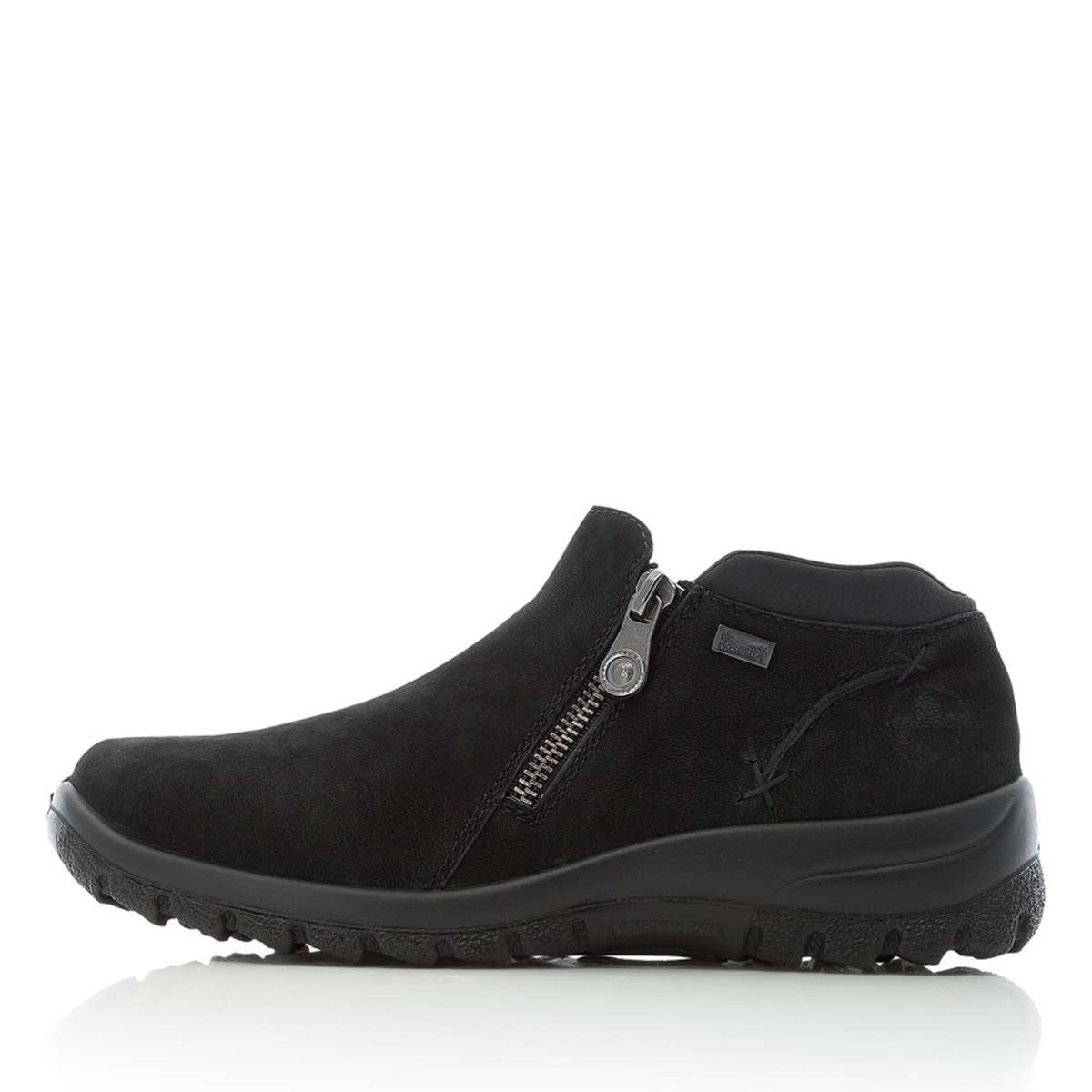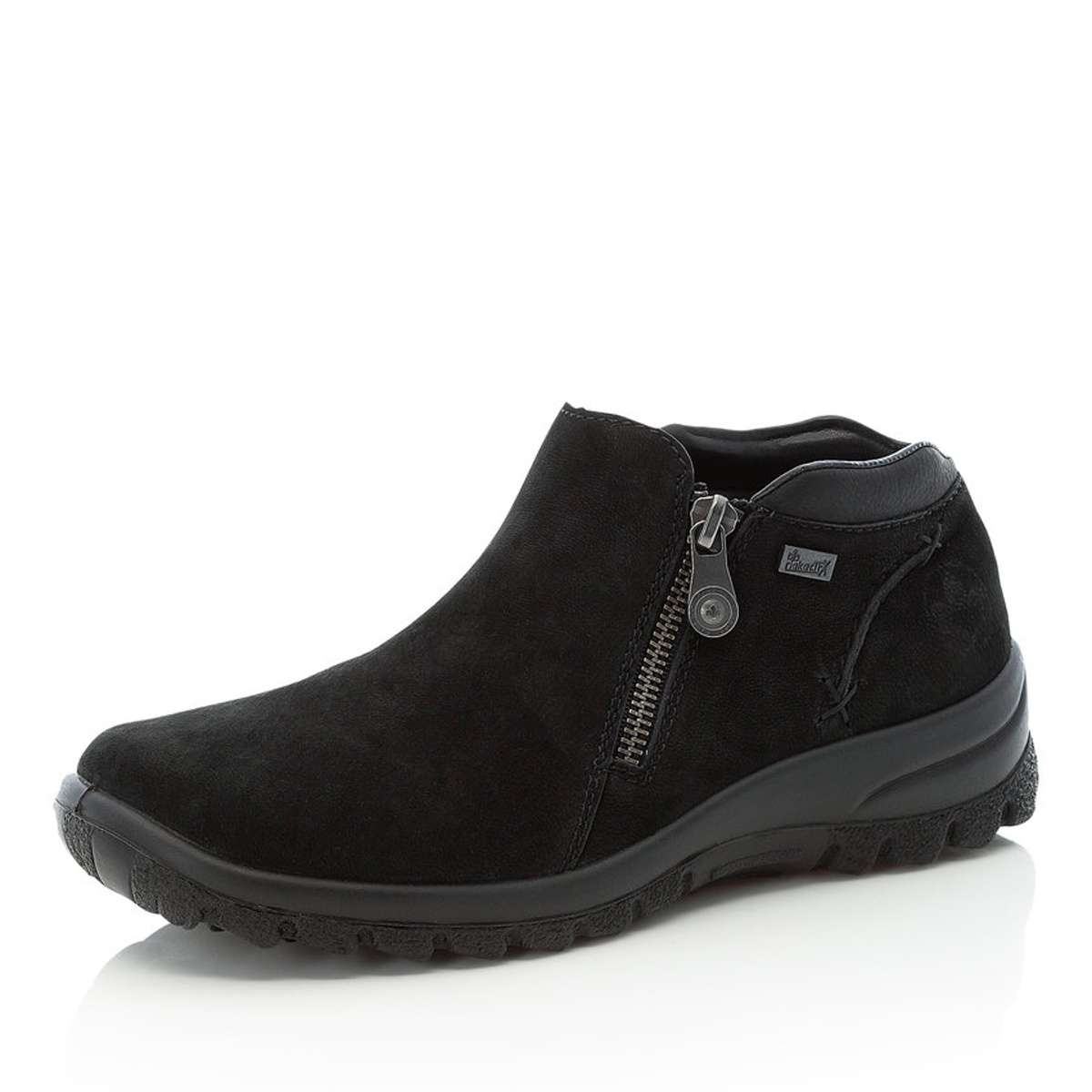 Kotníky jsou zdobeny pouze jemným šitím v barvě boty, funkčními zipy po stranách obuvi a logem značky Rieker na patě.