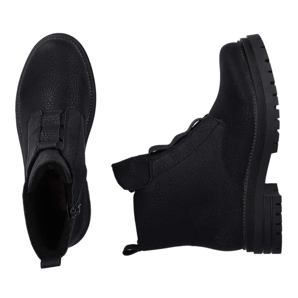 Tyto dámské kotníky v černé barvě od značky Rieker jsou zajímavé zpracováním nártové části. Kdy zde místo tkaniček nalezneme pružné gumičky, které společně se zipem z vnitřní strany usnadní nazouvání obuvi. Dalšími prvky, které zdobí tuto obuv jsou vytlačené loga značky, jemné prošívání, či zajímavá vyšší podešev. Příjemně měkká stélka a hřejivá podšívka Vám dodají pocit pohodlí ať už vyrazíte do města či jen tak na procházku se psem.