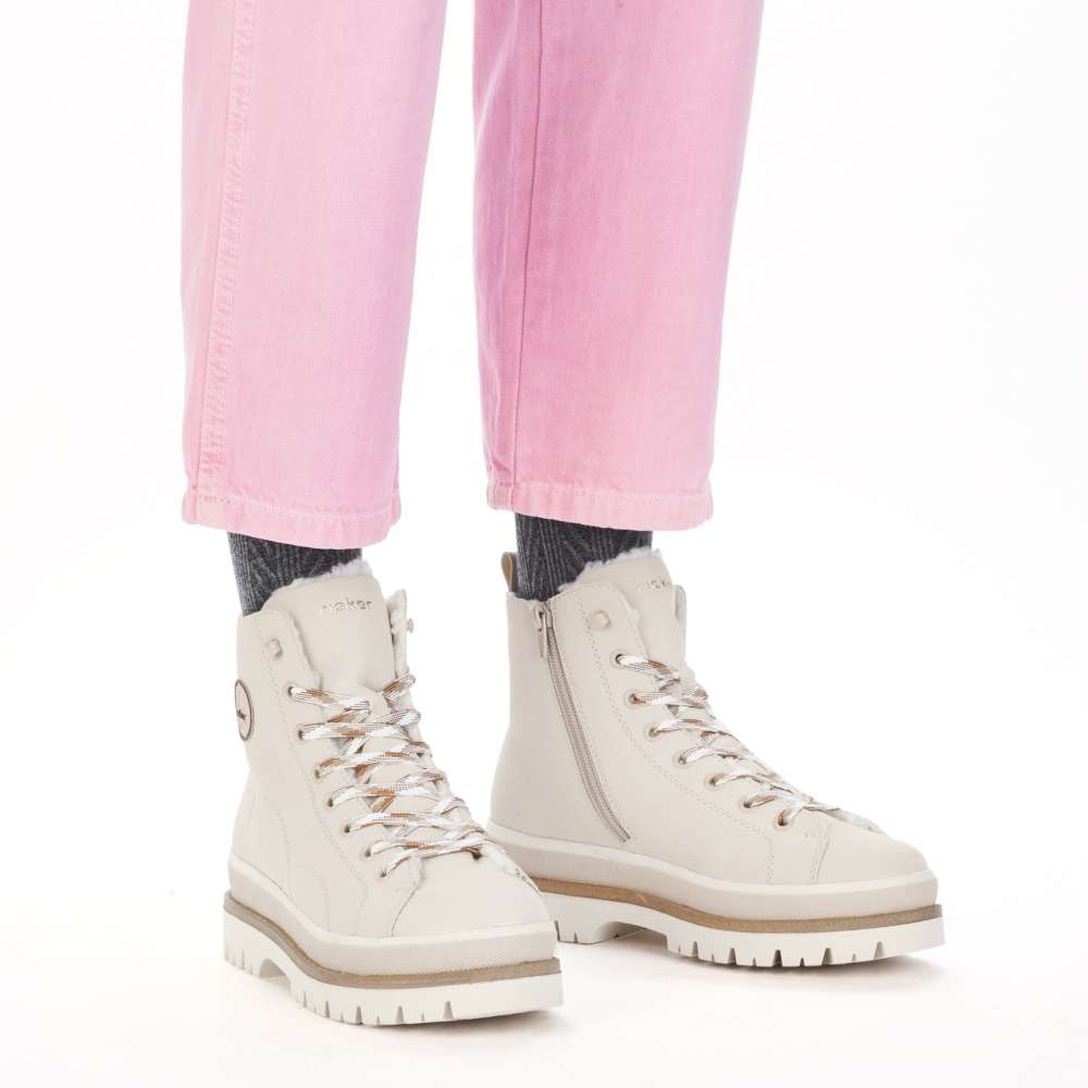 Detailní informace Tyto kotníkové boty značky Rieker jsou ideální volbou pro ženy, které si chtějí iv chladnějším období užívat spojení pohodlí a moderního vzhledu. Jejich světlý svršek působí svěže, přičemž jej doplňují efektní linie prošití a aplikace s logem značky, která dodává celkovému designu módní akcent. Díky praktickému bočnímu zipu se boty jednoduše obouvají a zouvají, zatímco šněrování trendy šňůrkou umožní přizpůsobit obuv přesně podle tvaru vaší nohy. Uvnitř vás čeká měkká vyjímatelná stélka a hřejivá textilní podšívka, které se postarají o maximální komfort. Nárazy tlumící podešev svým mohutným designem a výrazným vzorem zajistí jistý krok a pohodlí během celého dne. Pokud hledáte stylového a spolehlivého společníka pro zimní a podzimní dny, tyto kotníkové boty Rieker vás nezklamou – nabízejí vše, co od kvalitní obuvi očekáváte.