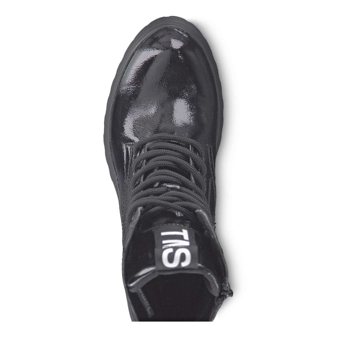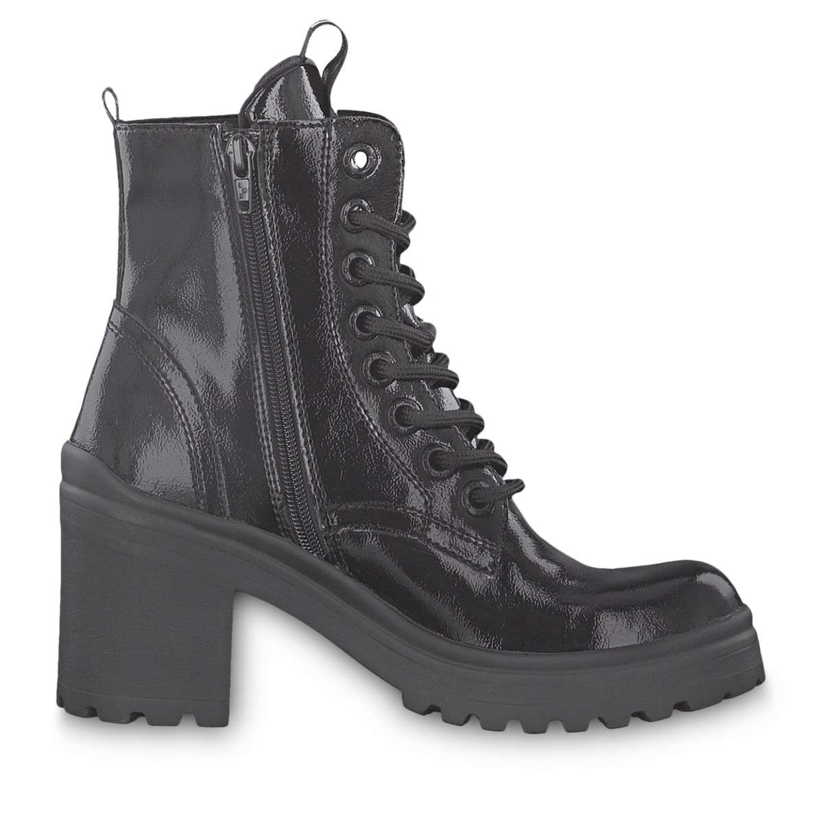 Klasické dámské kotníky v černé barvě jsou zdobené lakovaným svrškem a kontrastním nápisem na jazyku. Šněrováním si obuv upravíte dle svých požadavků. Na vnitřní straně se nachází funkční zip pro snadné obutí. Pevná a stabilní podešev doladí obuv k dokonalosti, je tedy vhodná pro všechny Vaše pracovní i volnočasové outfity.