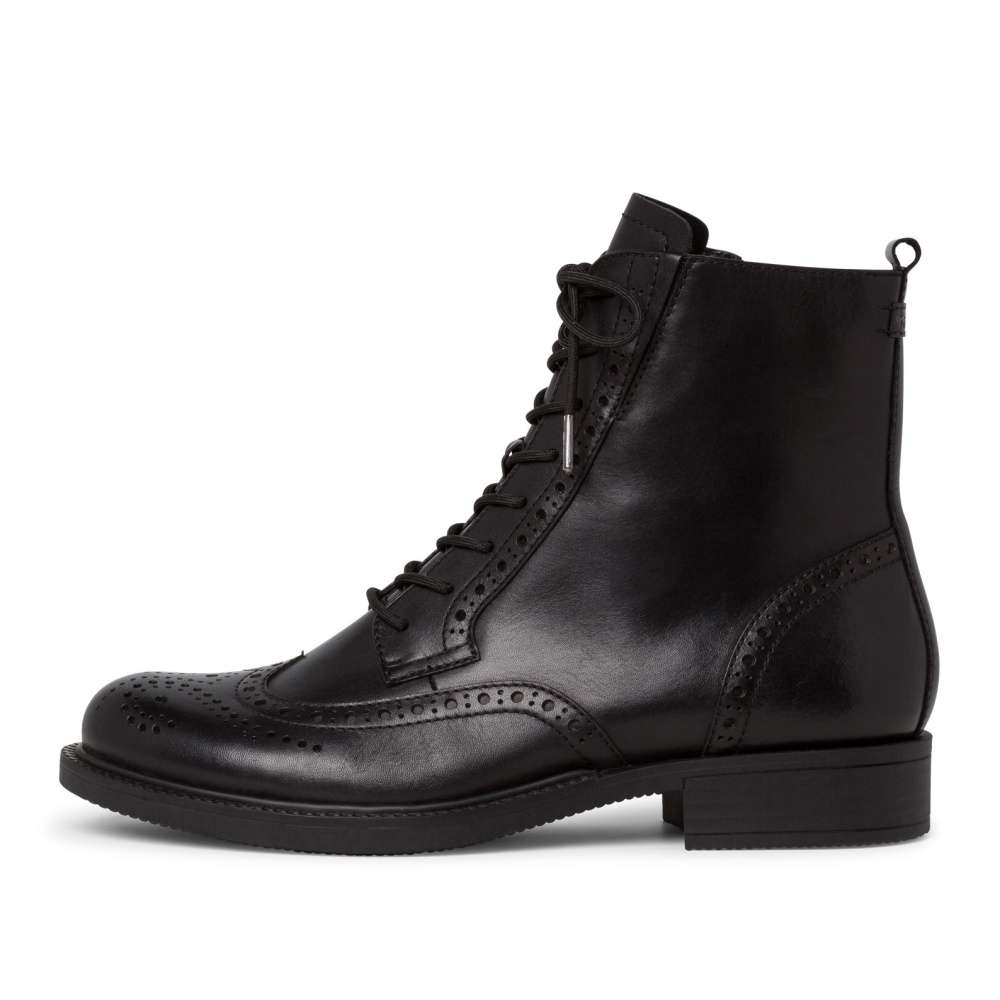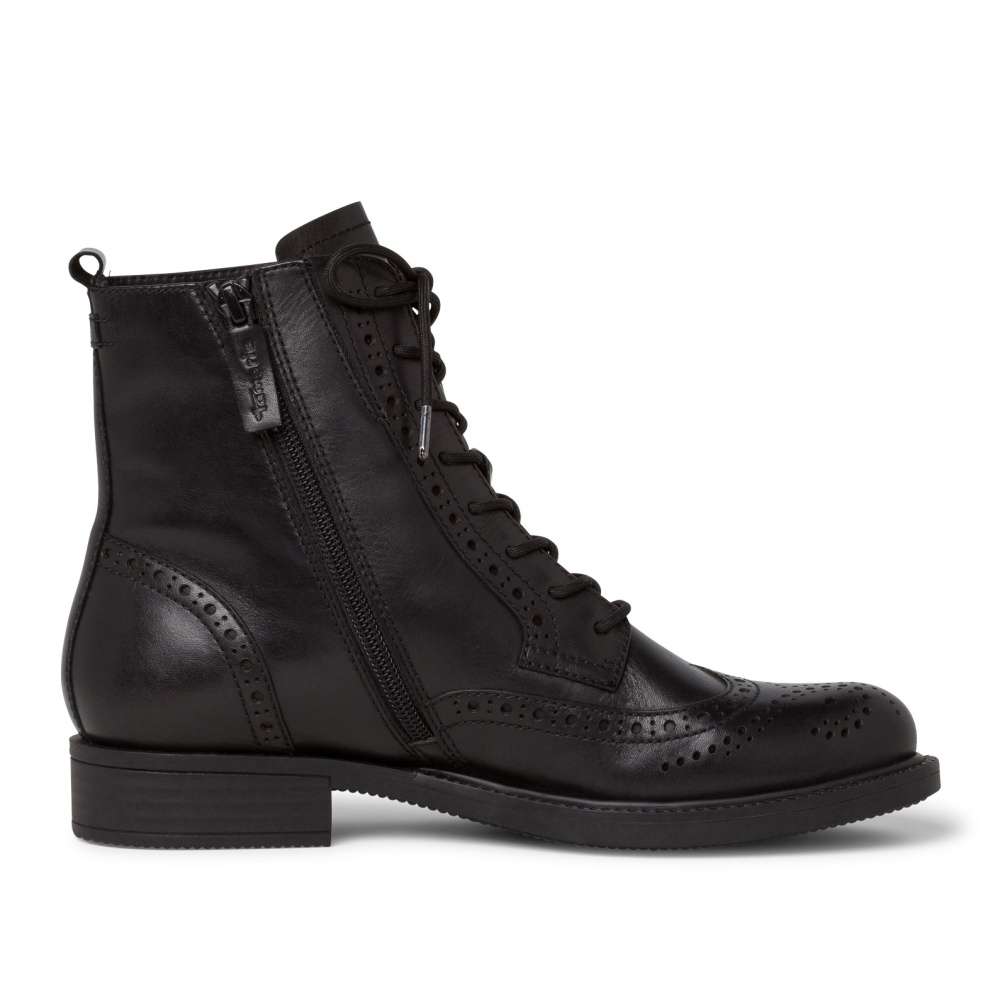 Neobyčejná kotníková obuv TAMARIS vyrobena z hladké kůže v černé barvě je ozvláštněna decentní imitací perforace na jejím svršku. Pro snadné obutí je na vnitřní straně použit funkční zip a tkaničky, díky kterým si můžete upravit velikost přímo na nohu. Můžete si v nich vyjít do kina nebo na procházku parkem.