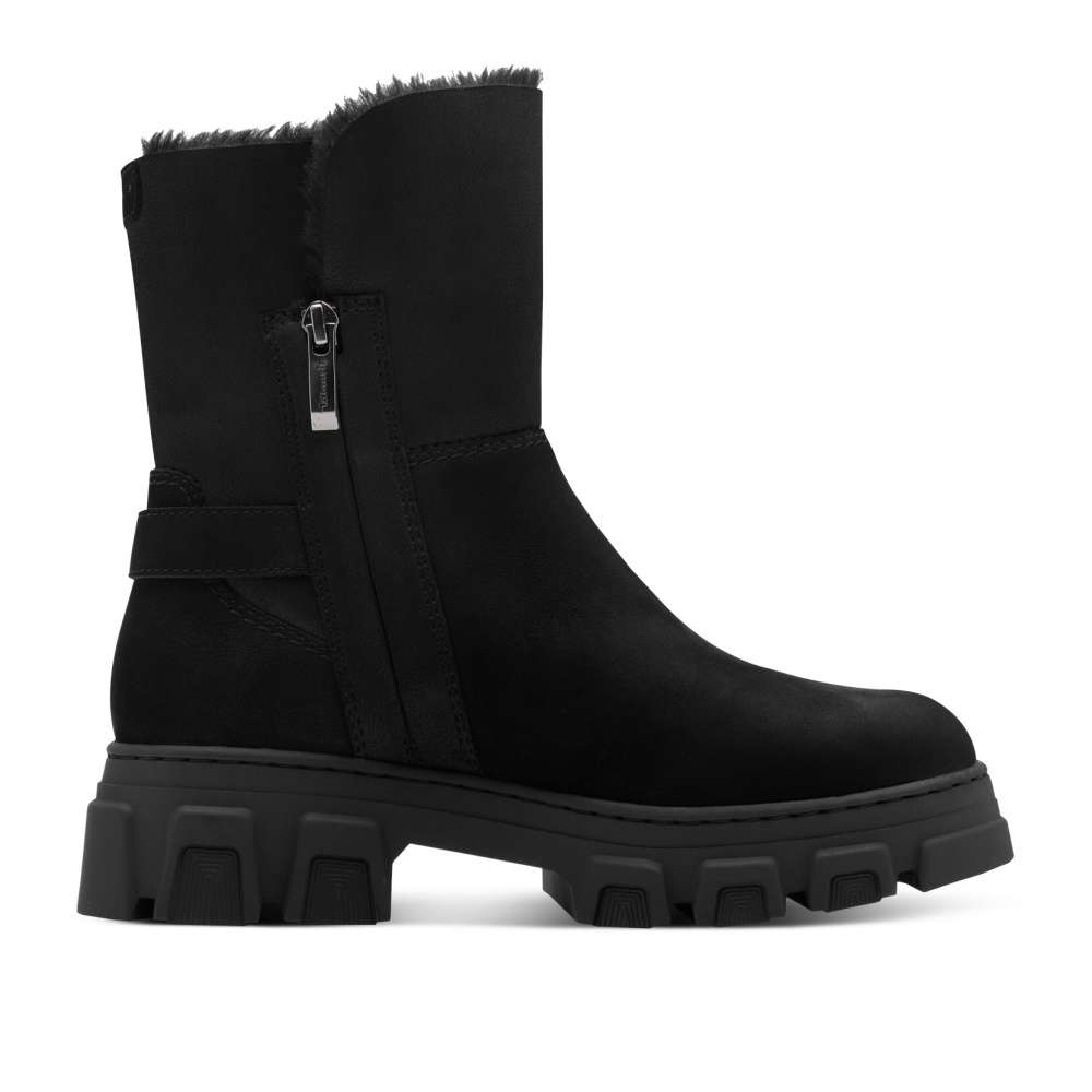 Detailní informace Každý váš krok bude doslova nepřehlédnutelný díky těmto stylovým botám značky Tamaris, které dokonale kombinují moderní design a mimořádné pohodlí. Kožený svršek černé barvy působí stylově díky dekoraci nastavitelné spony a jemný zimní nádech dodá textilní lemovaní horního okraje. Praktický boční zip zajišťuje snadné a rychlé obouvání, takže si boty pohodlně obujete i ve chvílích, kdy spěcháte. Uvnitř bot se nachází měkká, vyjímatelná stélka, která poskytuje celodenní komfort a zároveň umožňuje snadné čištění nebo výměnu. Hřejivá podšívka zaručuje příjemný pocit tepla a díky tomu jsou ideálním obutím i do chladnějšího počasí. Robustní podešev se stabilní konstrukcí zajišťuje jistý krok na různých površích a svým mohutným stylem zvýrazní půvab těchto bot. Tyto boty Tamaris nejsou jen módním doplňkem – jsou spolehlivým společníkem pro každý den. Ideálně se hodí do města, do práce, na procházky či na volnočasové aktivity.