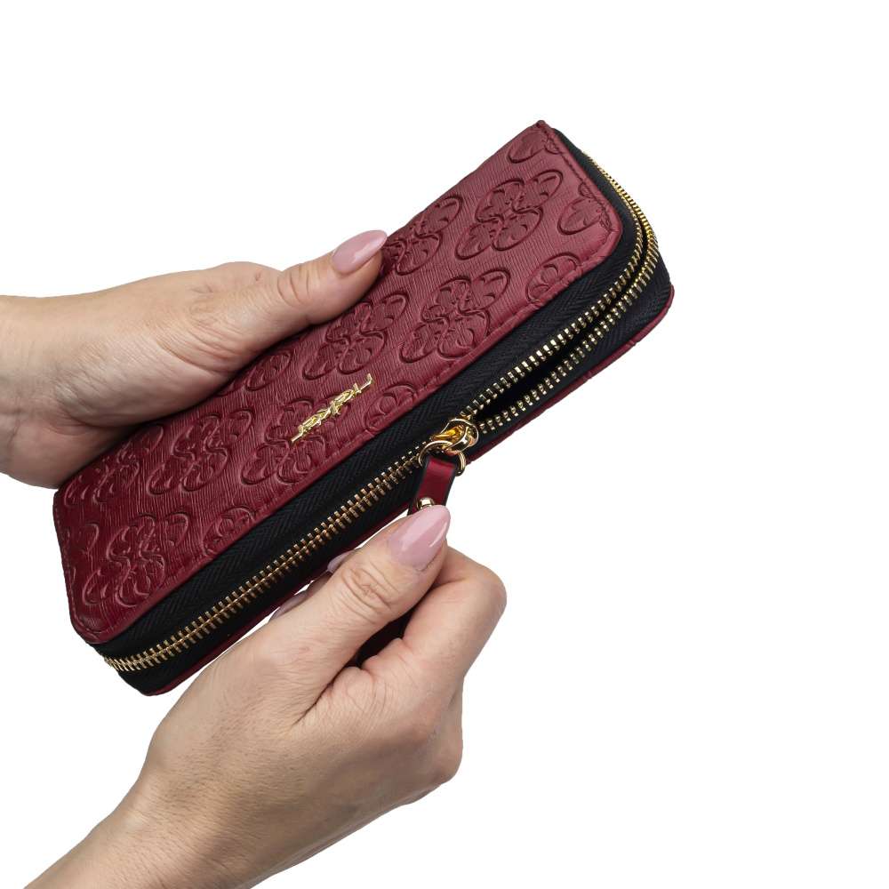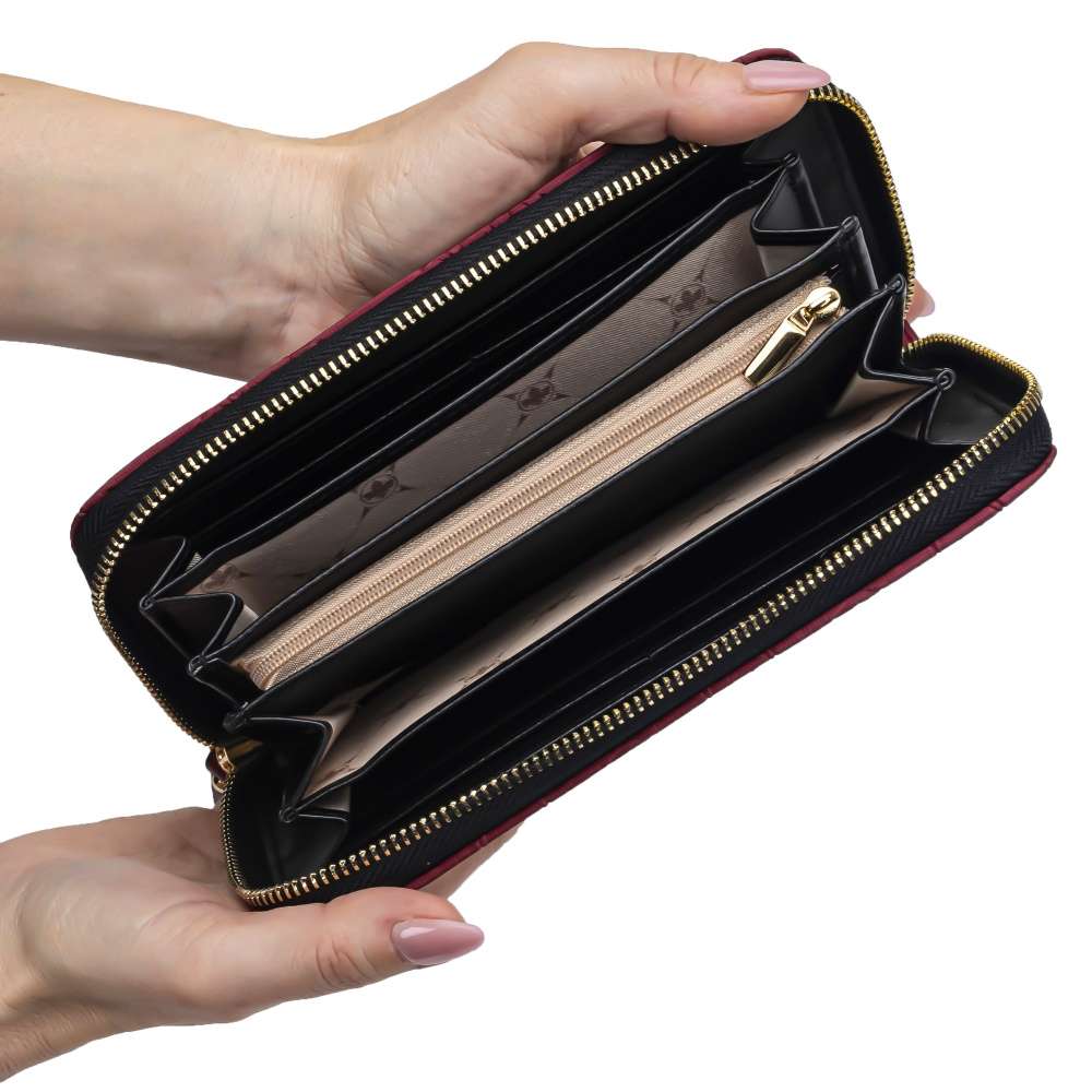 Tuto dámskou peněženku značky RIEKER si zamilujete už na první pohled. Svršek v červené barvě je obohacen vytlačeným vzorem, kde na přední straně vyniká zlatavý nápis. Peněženka má zip, kde po rozevření lze vidět několik kapes na karty, drobné mince nebo podélné přihrádky na bankovky. Tento krásný model se rozhodně stane Vašim oblíbeným doplňkem pro každodenní používání. Rozměry: cca v 10,5 cm x š 20 cm x h 3 cm