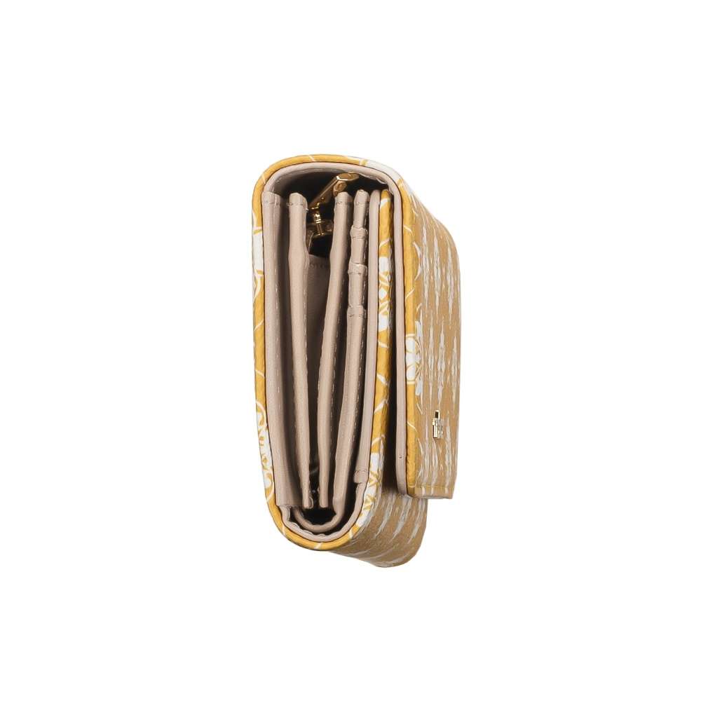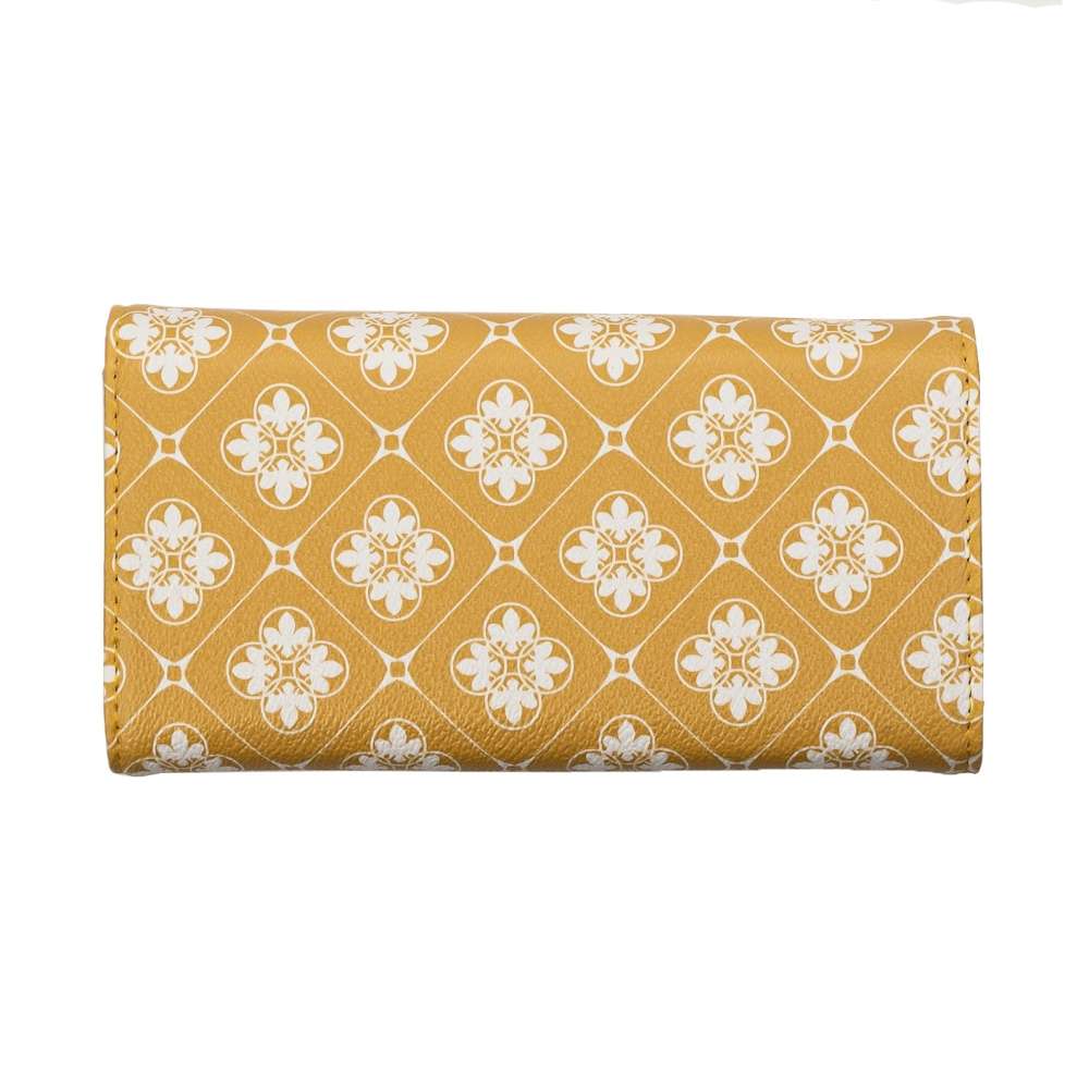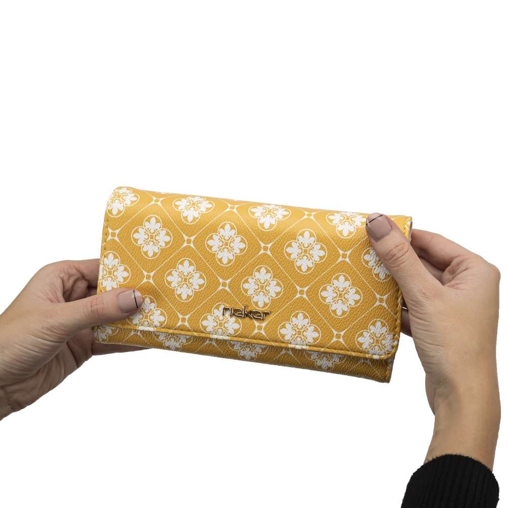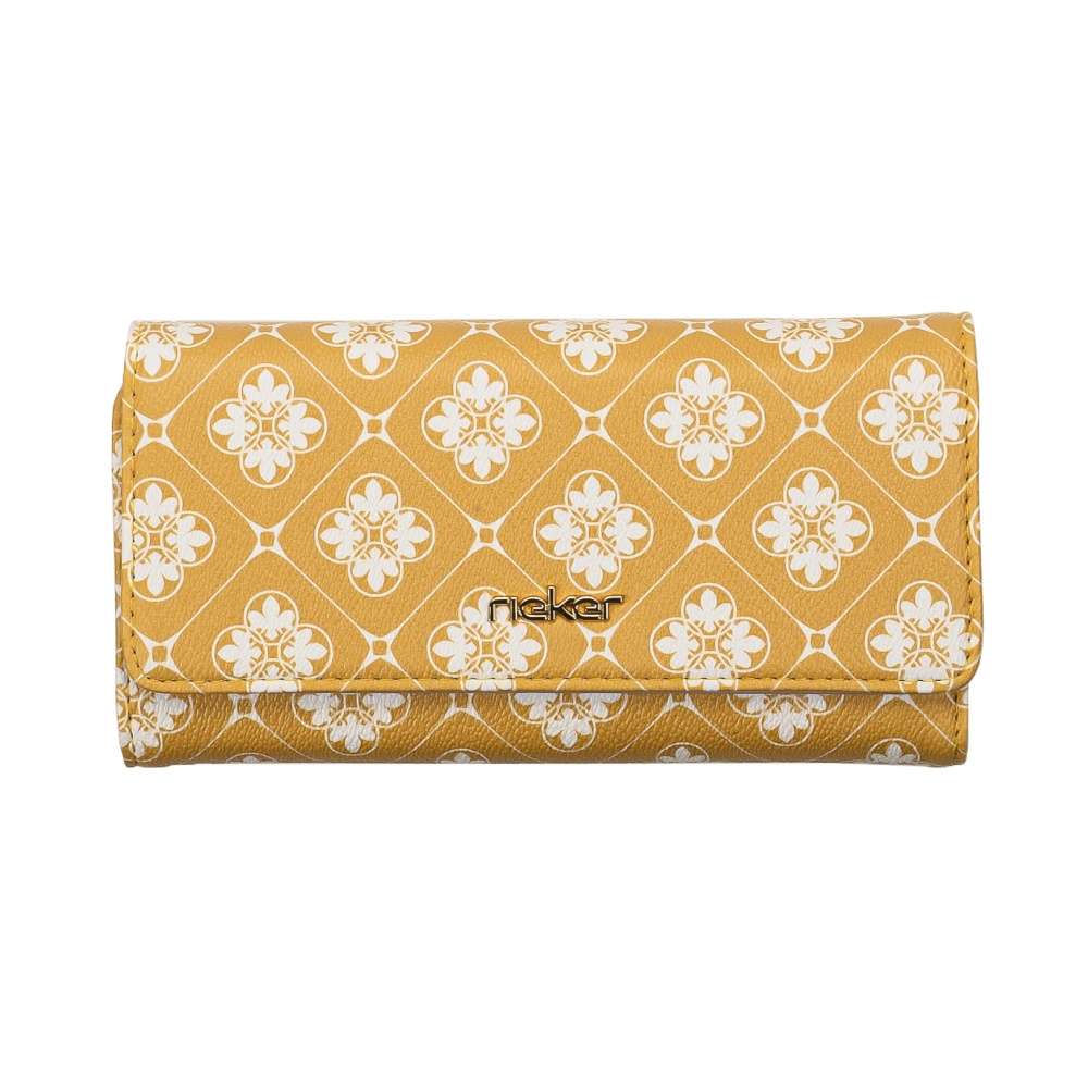 Dopřejte si tuto dámskou peněženku značky RIEKER v módním provedení. Svrchní materiál v krásné žluté barvě je dozdoben stylovým vzorem, na kterém vyniká na přední straně zlatavý nápis. Peněženka má klopu na kovový cvoček, kde po rozevření lze vidět například několik dalších kapsiček na karty, drobné mince nebo podélné přihrádky na bankovky. Velmi vkusný a praktický kus, který určitě každá ocení. Rozměry: cca v 10 cm x š 19 cm x h 4 cm