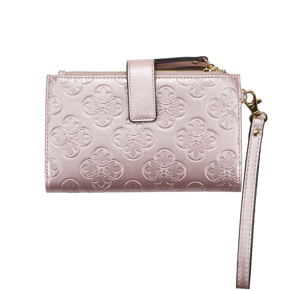 Tato dámská peněženka značky RIEKER Vás okouzlí svým stylovým provedením. Svršek v růžové barvě je dozdoben vytlačeným vzorem, zlatavým nápisem a odepínatelným poutkem. Peněženka má dvě kapsy zapínatelné zipem a celkově se uzavírá páskem s drukem. Po rozevření peněženky lze vidět několik dalších kapsiček na karty, mobilní telefon nebo podélné přihrádky na bankovky. Tato peněženka Vám bude věrným společníkem každý den. Rozměry: cca v 12 cm x š 18,5 cm x h 3 cm