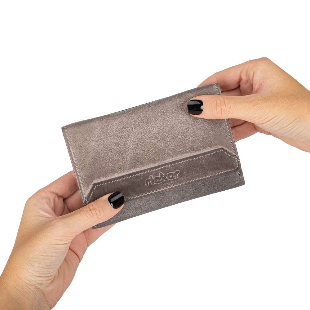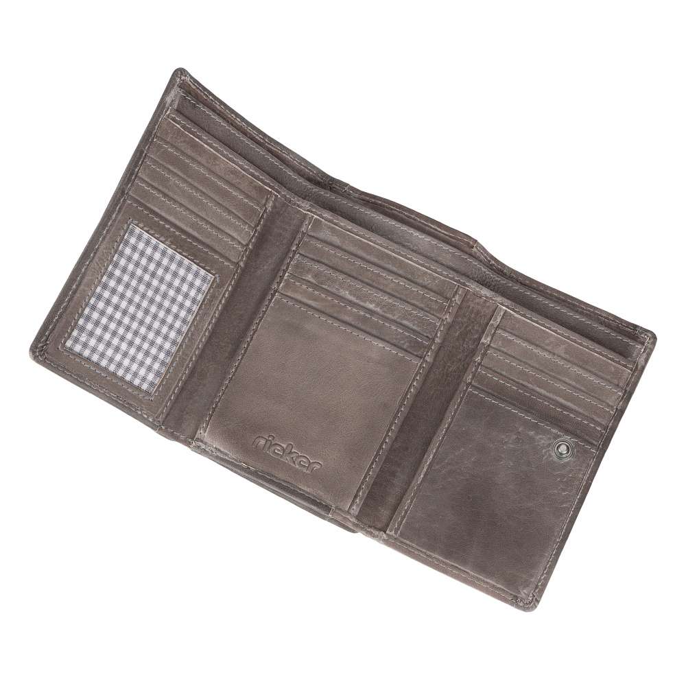 Tato jedinečná peněženka značky RIEKER bude pro Vás dokonalým doplňkem. Svršek peněženky vyrobený z kvalitní hovězí kůže je na přední straně ozdoben jemně vytlačeným názvem značky. Peněženka je rozdělena na dvě části. Část uzavíratelná cvočkem má jedenáct kapsiček na karty, kapsičku s folií na fotky, tři postranní skryté kapsy a dvě podlouhlé na papírové peníze. Kapsa uzavíratelná zipem je rozdělena na dvě části a vhodná třeba na drobné peníze. Tato peněženka bude skvělým doplňkem nejen k obuvi, ale i ke kabelkám z naší nabídky.