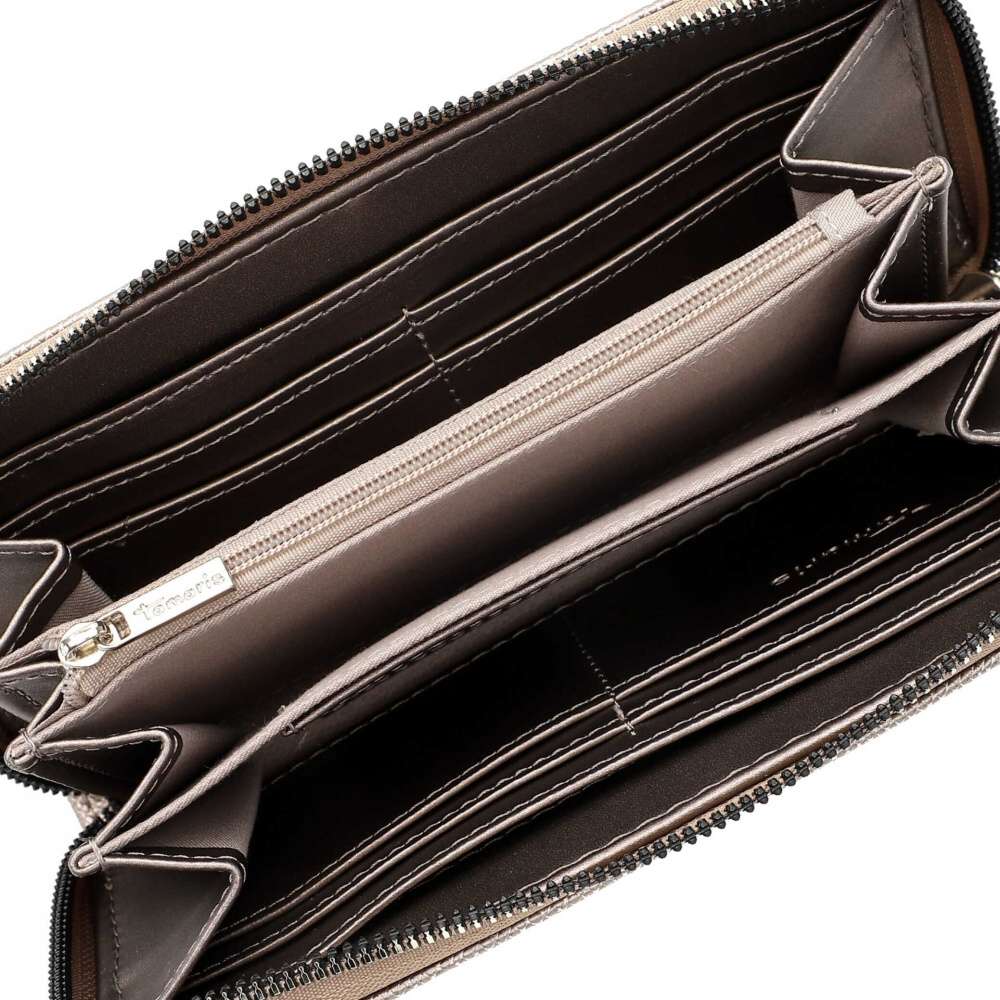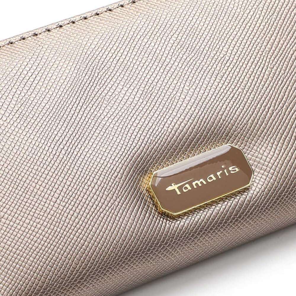 Této peněžence s logem značky Tamaris a metalicky stříbrnou barvou svršku skutečně nelze odolat. Její lesk dodává vzhledu osobitost a je ideálním doplňkem pro každou ženu, která chce vyjádřit svou jedinečnost. Moderní design je doplněn praktickým uspořádáním přihrádek, které umožňuje snadnou organizaci všech potřebných věcí, které budou v bezpečí díky uzavíraní zipem. Tento stylový kousek se stane nejen nezbytným, ale i módním doplňkem vašeho každodenního vzhledu.