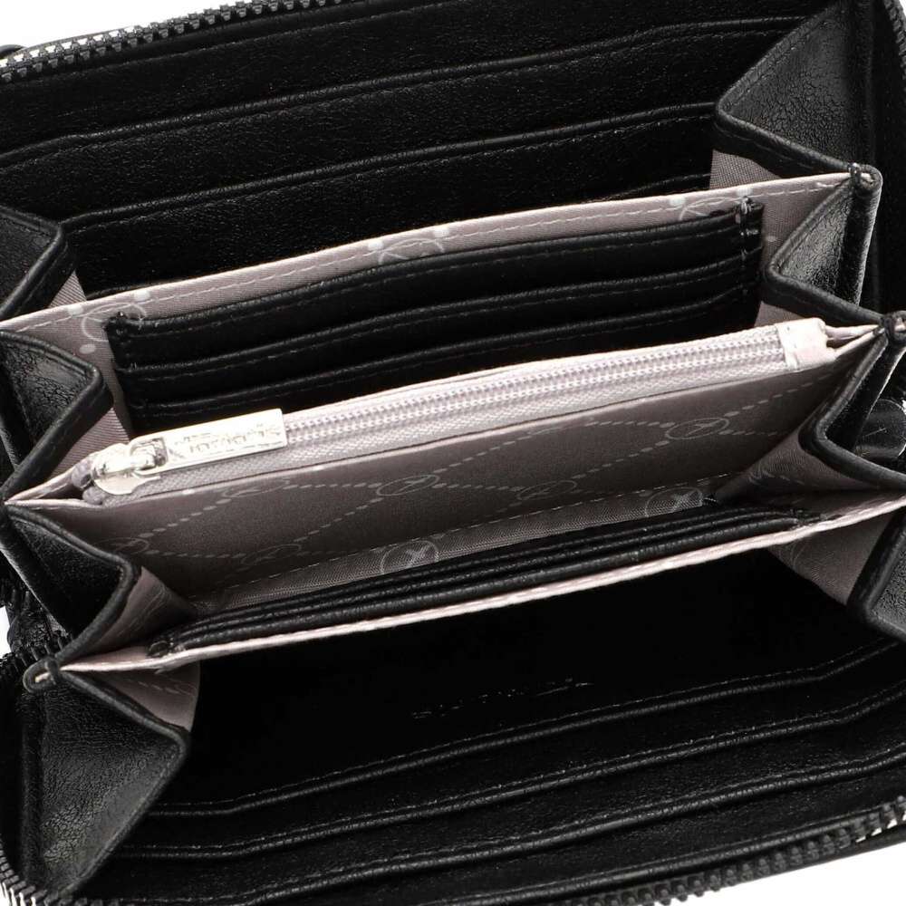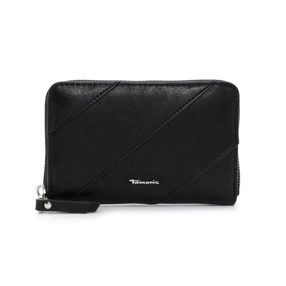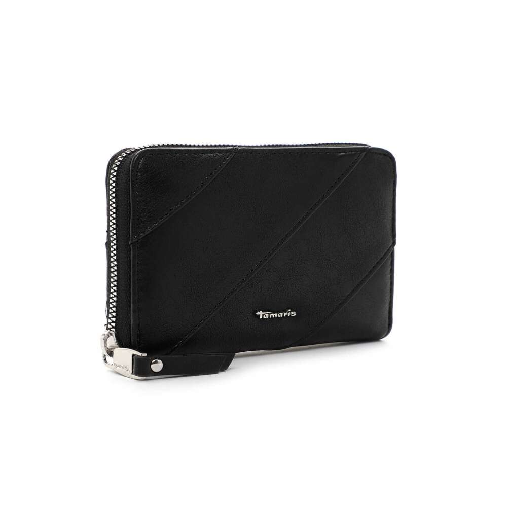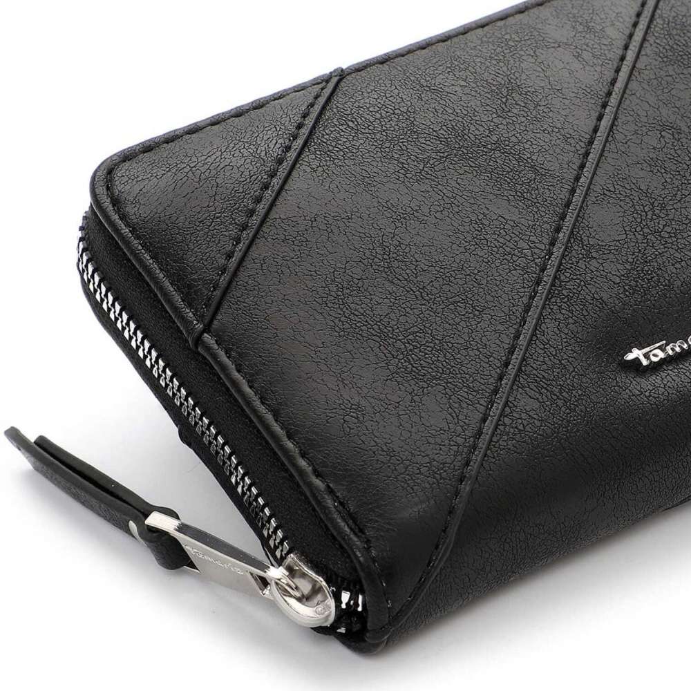 Krásný design této černé peněženky Tamaris zaujme svým vzorem a zdobným logem značky. K zapínání slouží zip a po jeho rozepnutí uvnitř najdeme praktické kapsičky na karty, papírové peníze a kapsu uzavíratelnou zipem, vhodnou například na drobné mince. Tato peněženka bude skvělým doplňkem nejen k obuvi, ale také ke kabelkám z naší nabídky.