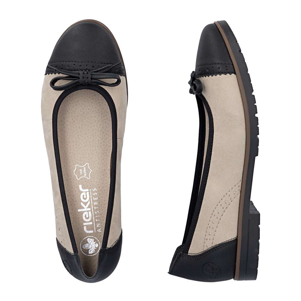 Tyto baleríny značky RIEKER jsou ztělesněním jemné elegance a maximálního pohodlí, které potěší každou ženu při každém kroku. Světlý svršek s černou špičkou a patou vytváří působivý barevný kontrast doplněný vzorem, jemným prošíváním a drobnou mašličkou, dodávající botám ženskost a šarm, které z nich dělají nezaměnitelný módní doplněk. Měkká kožená stélka obepne chodidlo a poskytne vám pocit komfortu, zatímco podešev tlumící nárazy zajistí jistotu a stabilitu při každém kroku. S těmito balerínami se i obyčejná procházka městem stává malým zážitkem, jsou ideální volbou pro ženy, které chtějí spojit nadčasový design, ženský půvab a pohodlí – baleríny RIEKER vám dodají nejen módní vzhled, ale také pocit jistoty a radosti při každém kroku. Technologie: Antistress – díky čtyřem antistresovým vlastnostem – lehkosti, pružnosti, prostornosti a vynikající absorpci nárazů – vám boty RIEKER nabídnou komfortnější chůzi.