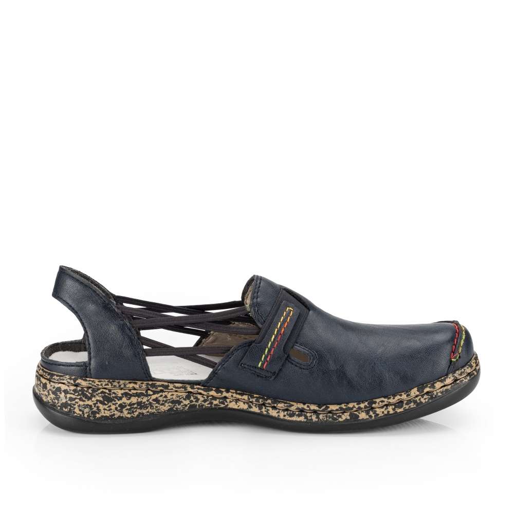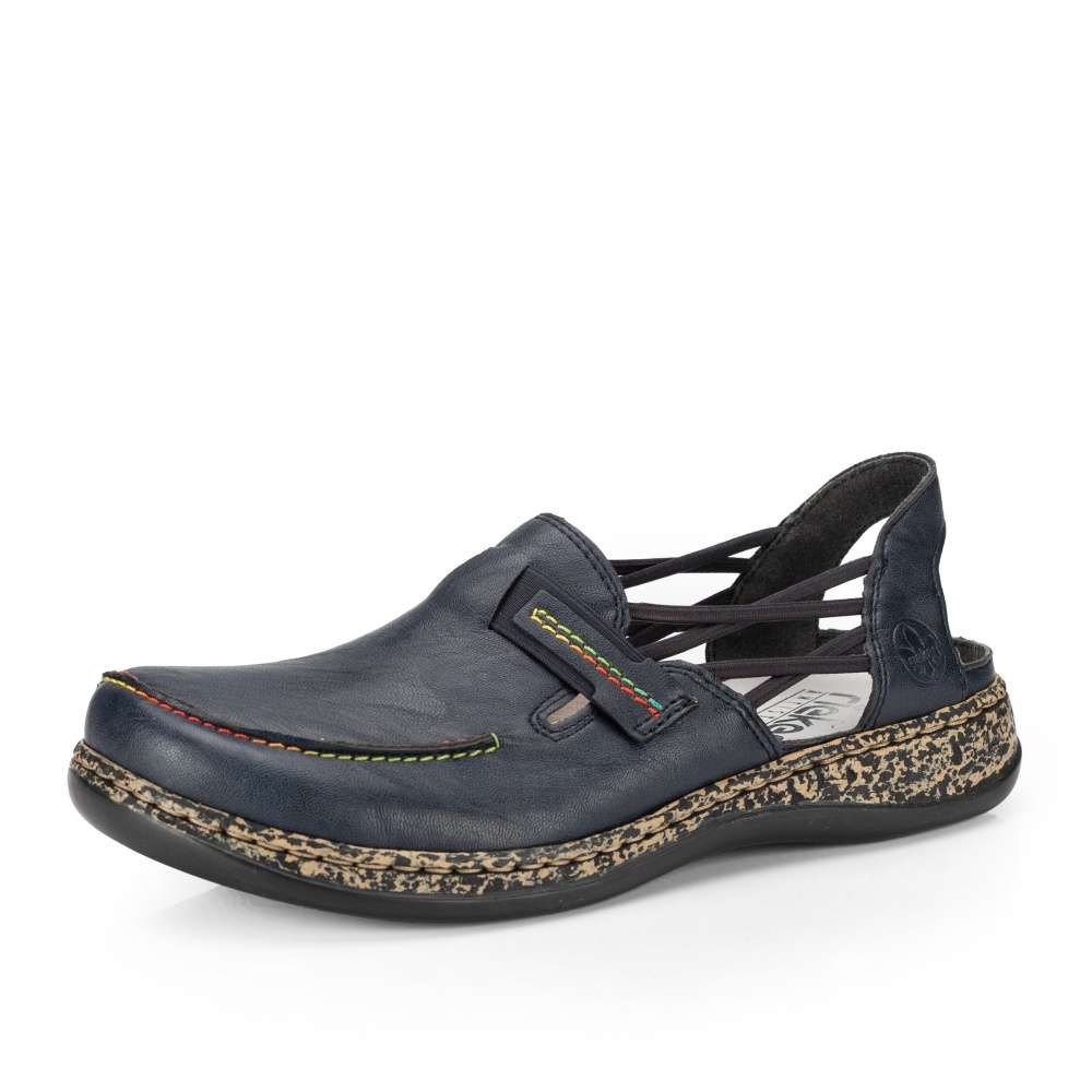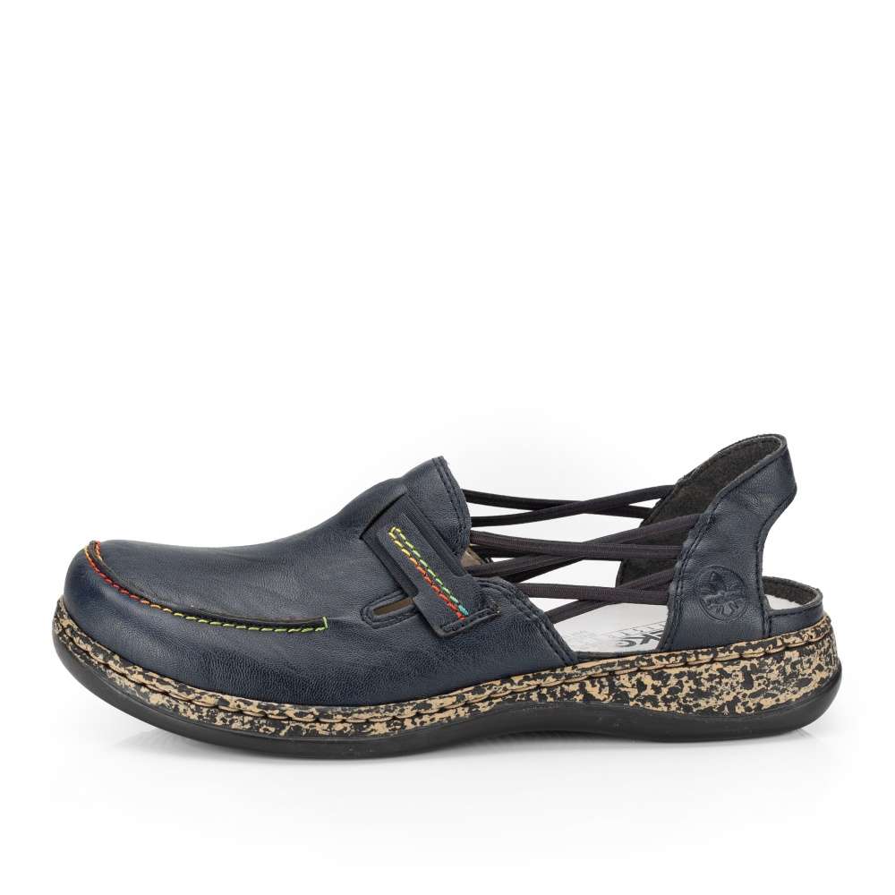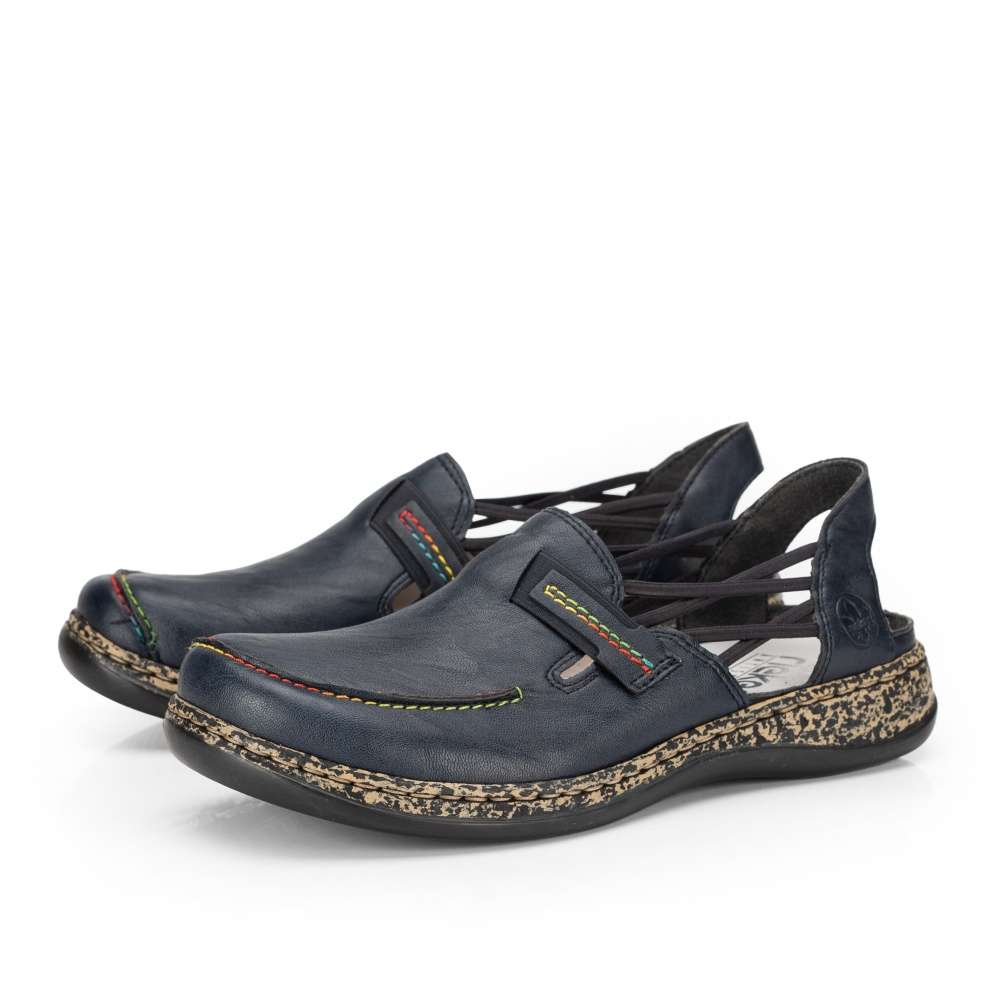 Tato dámská polobotka značky RIEKER na nižší podešvi. Zdobena je barevným šitím, gumičkami z obou stran pro lepší obouvání a odvětrávání v horkých letních dnech. Díky technologii použité v kontrastní podešvi je obuv lehká a flexibilní. Tato obuv bude skvělá pro Vaše celodenní procházky městem. Technologie: Antistress – podešev je díky této technologii lehká, flexibilní, absorbuje nárazy při došlapu a snadno se přizpůsobí každé noze.