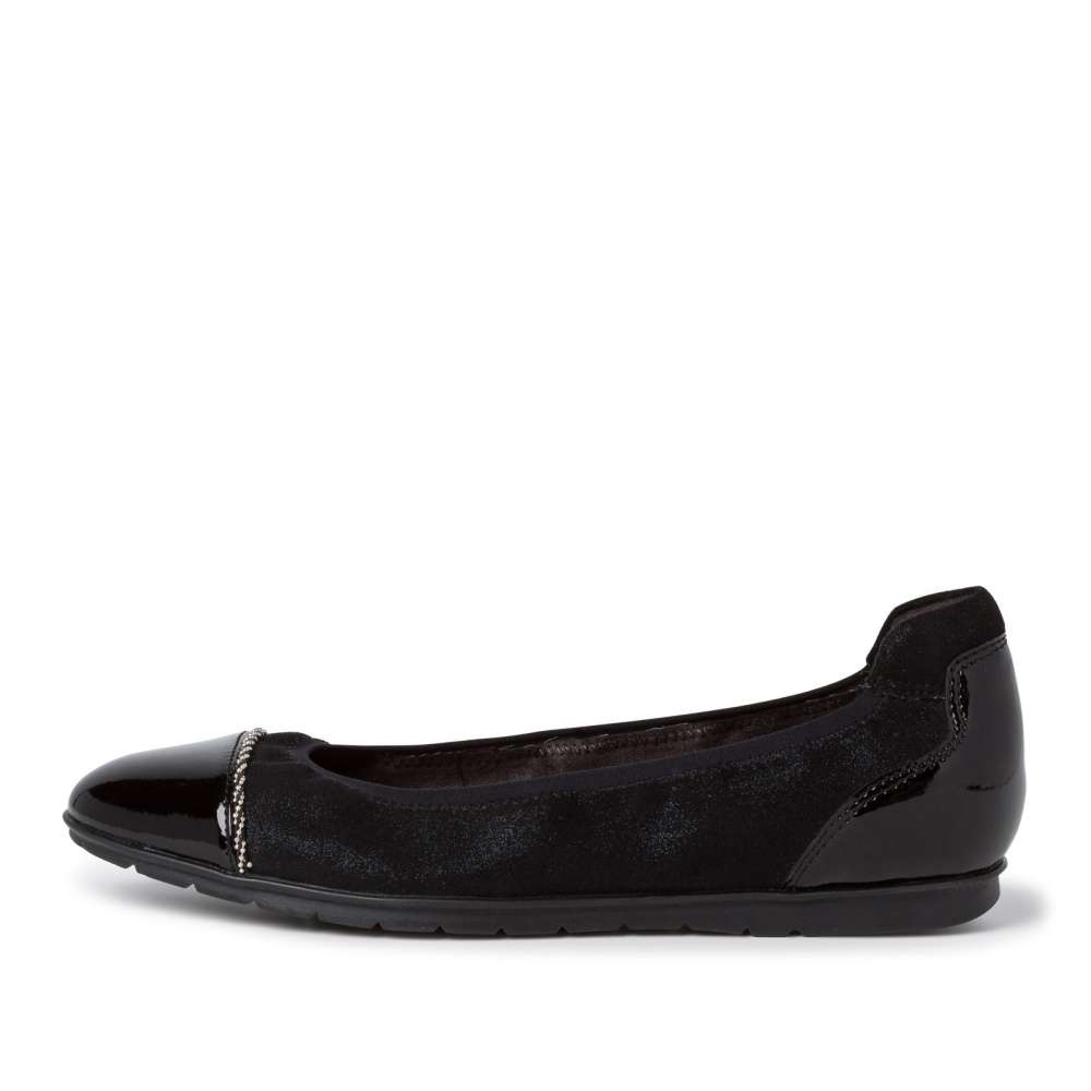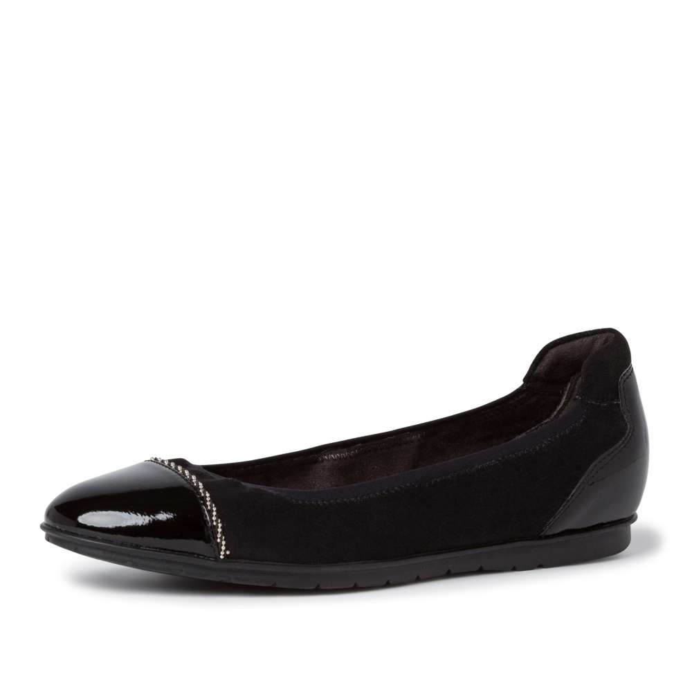 Dámské balerínky značky TAMARIS zajímavého vzhledu jsou zdobené lakovanými prvky ve špici a patě i stříbrným páskem přes nárt.