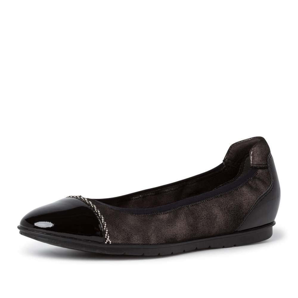 Dámské balerínky značky TAMARIS zajímavého vzhledu jsou zdobené lakovanými prvky ve špici a patě i stříbrným páskem přes nárt.