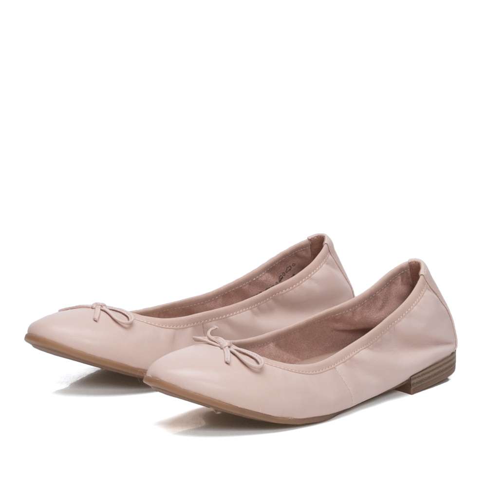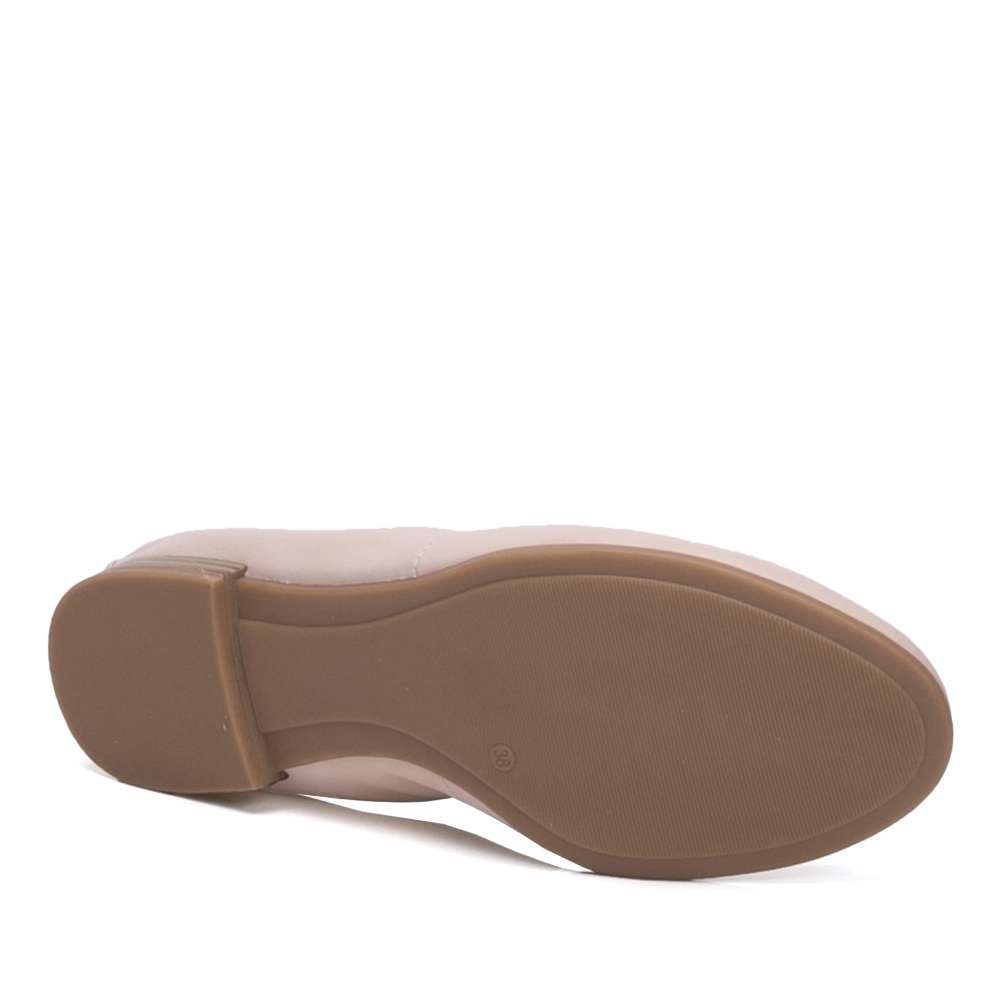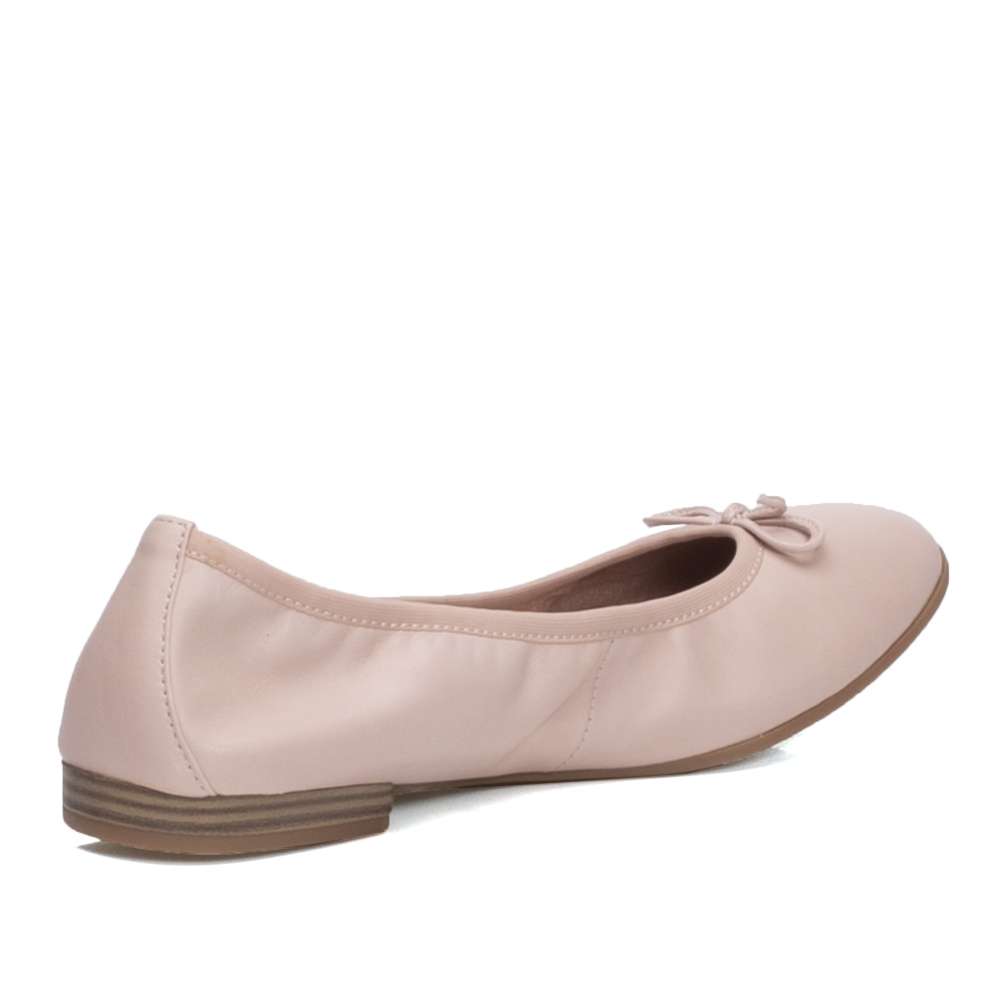 Kožený hladký svršek je v přední části zdobený jemnou mašličkou a doladěn nízkým podpatkem. Pružný materiál po obvodu, se přizpůsobí Vaší noze.
