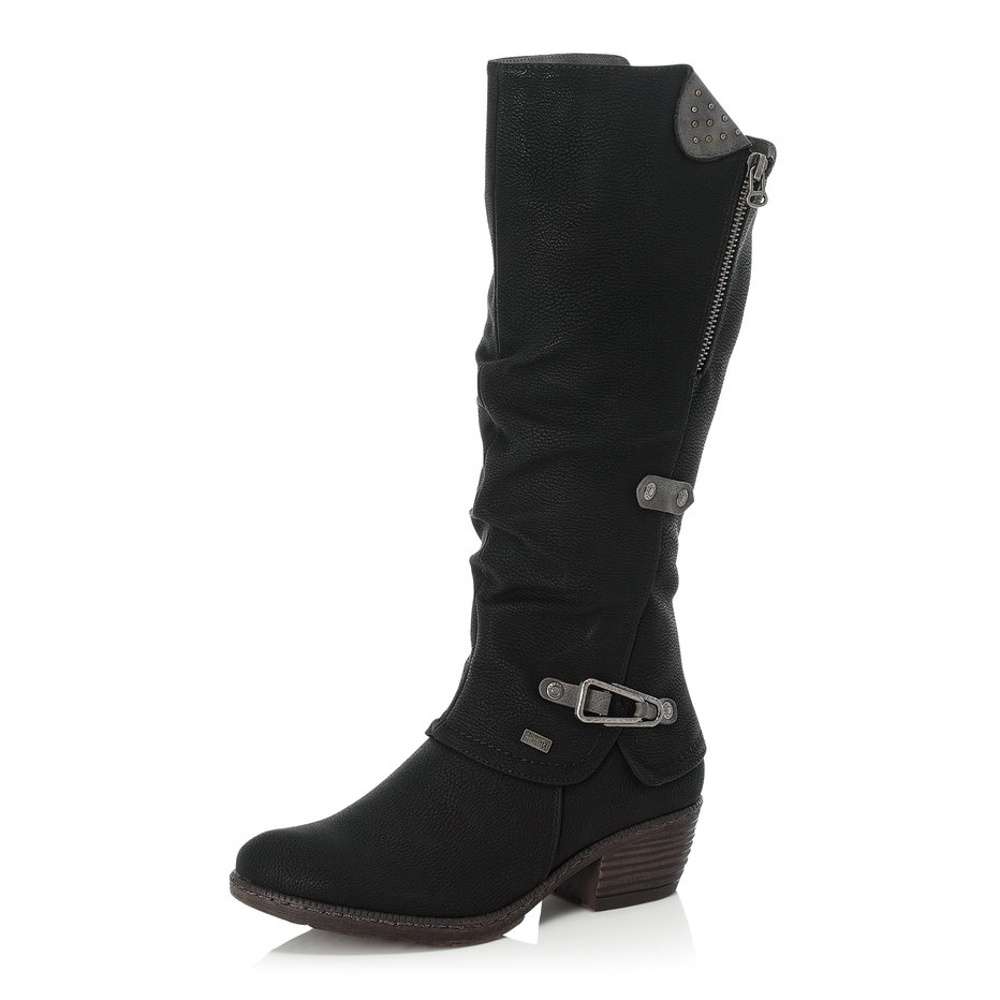 Na černém svršku se díly přes sebe zajímavě překrývají. Od kotníku nahoru jsou boty mÍrně zvrásněné a mají na sobě kovové prvky ve spojení s detaily v šedé barvě. Na vnější straně je u horního okraje kratší funkční zip, který lze rozepnout a povolit tak obuv kolem lýtka. Na vnitřní straně je druhý zip, který je po celé délce a slouží pro pohodlné nazouvání. Díky membráně RiekerTex a kožešině budete v suchu a teple i za nepříznivého počasí.
