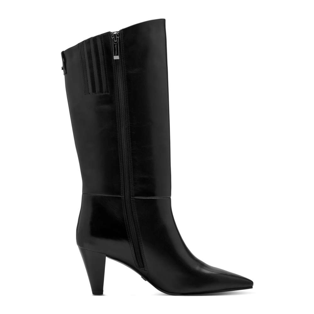 Detailní informace Dopřejte si obuv, která kombinuje moderní design a maximální pohodlí. Tyto černé kozačky značky TAMARIS Vás okouzlí na první pohled svým elegantním vzhledem, který podtrhuje kvalitní kožené provedení svršku. Praktický zip na vnitřní straně zajišťuje snadné a rychlé obutí, zatímco pružná horní část se dokonale přizpůsobí tvaru Vaší nohy a poskytne tak maximální komfort při každém kroku. O Vaše chodidla se postará měkká stélka s paměťovou pěnou, která změkčuje došlap a poskytuje příjemnou podporu i při celodenním nošení. Kvalitní podešev s vysokým podpatkem dodává kozačkám ženský půvab a opticky prodlouží siluetu. Tyto kozačky Tamaris snadno sladíte s Vaším šatníkem – skvěle vyniknou jak v kombinaci s elegantním kabátem, tak i s úzkými džínami a svetrem. Jsou dokonalou volbou pro ženy, které hledají spojení stylu, funkčnosti a komfortu v každodenním životě i při výjimečných příležitostech.