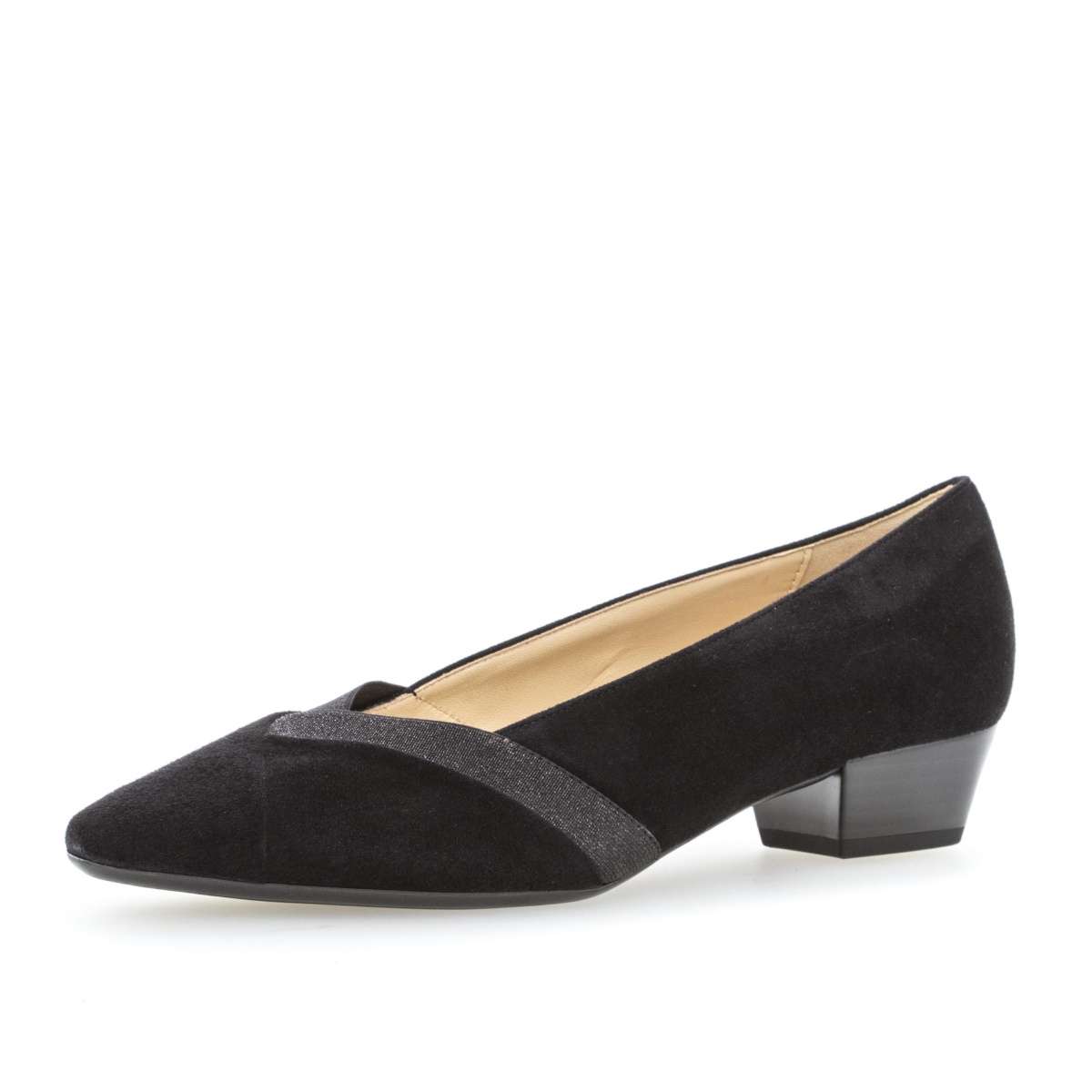 Lodičky černé barvy jejichž svršek kombinuje světlejší třpytivou a semišovou část. Přední část lodiček je špičatá a zdobená překládáním.