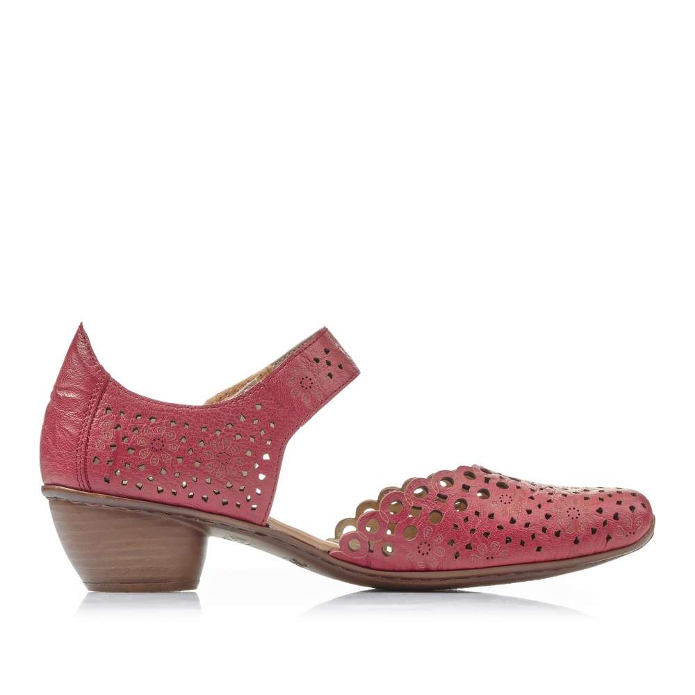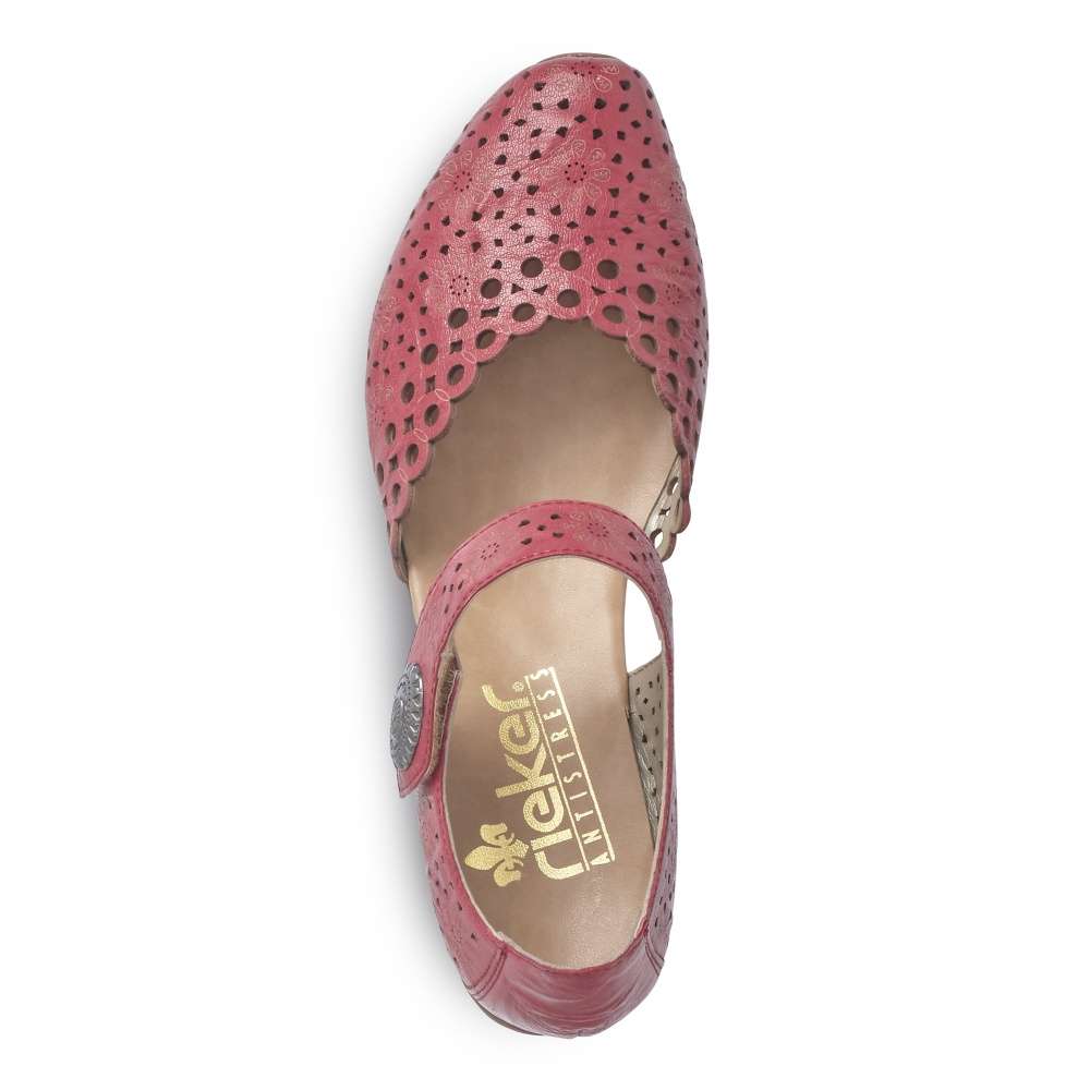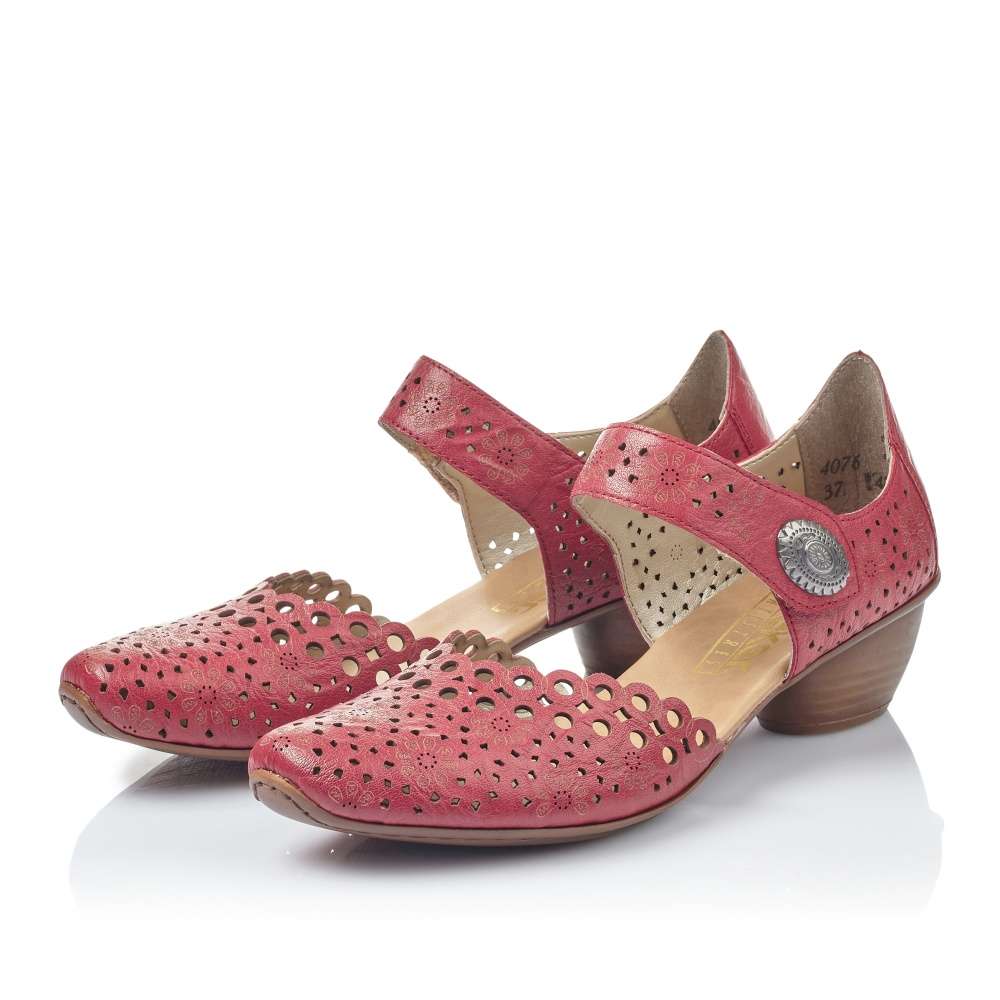 Dámská lodička značky Rieker je zvláštní svým provedením svršku. Ten je perforován a dozdoben vyrytými kytičkami. Pásek kolem kotníku má zapínání na suchý zip a je ozvláštněn kovovou aplikací. O pohodlí na každém kroku se postarají nízký stabilní podpatek a měkká stélka. Tyto lodičky sladíte s jakýmkoliv outfitem.