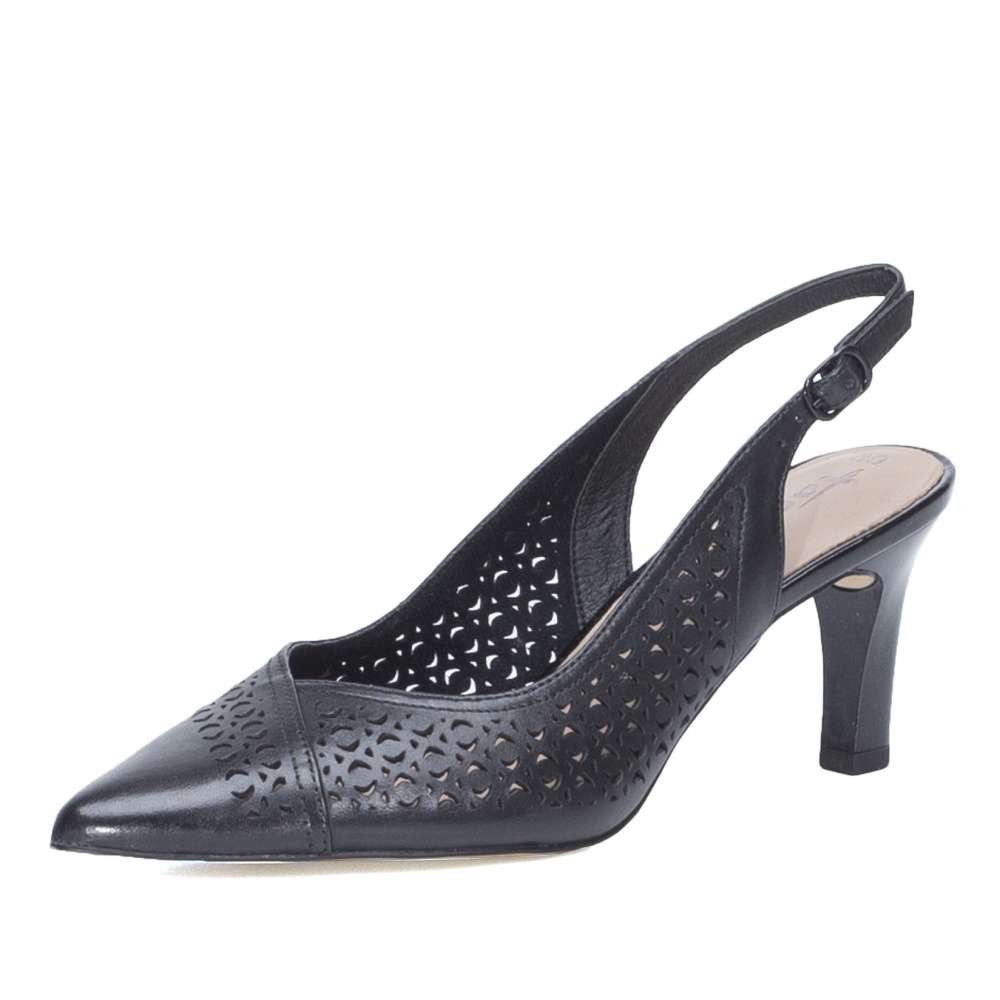 TAMARIS kožené elegantní lodičky s otevřenou patou. Svršek je perforovaný a tím dodává botě jemný vzhled, v přední části svršku je do špičky decentní vykrojení. Na patě je vsazená gumička pod sponkou, díky které jdou lodičky snadno a pohodlně obout. Podešev je pevná a skvělá pro dny plné chůze, kdy chcete vypadat elegantně nebo i jen pro běžné nošení do práce nebo do města.