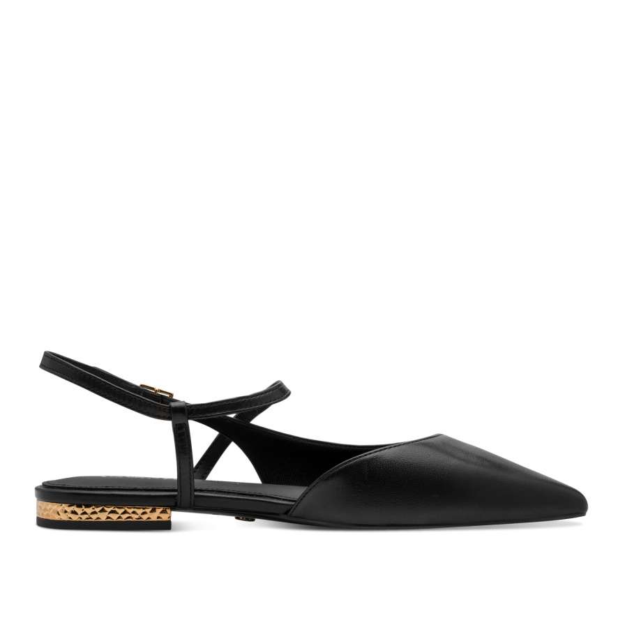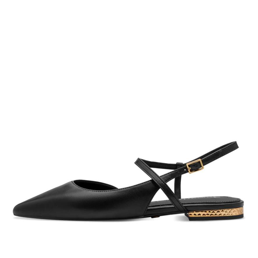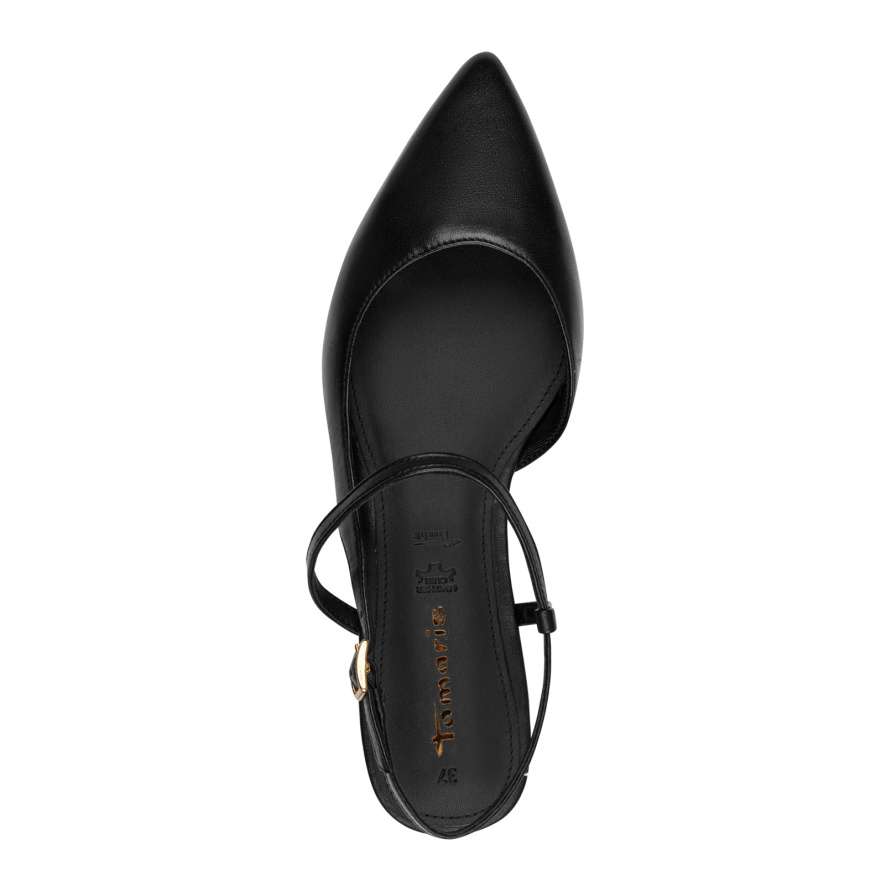 Působivá elegance, kterou si zamilujete – to jsou tyto dámské boty značky TAMARIS. Černý kožený svršek v kombinaci s úzkou špičkou vytváří nadčasově stylový vzhled, který okamžitě zvýrazní váš outfit. Zadní pásek s nastavitelnou sponou se postará o perfektní přizpůsobení a zároveň dodává botám elegantní detail. O pohodlí se stará měkká kožená stélka, která poskytuje příjemný pocit při každém kroku – bez kompromisů i při celodenním nošení. Nízký podpatek je doplněn dekorativní aplikací se zlatými odlesky, která jemně podtrhuje ženský šarm a dodává botám luxusní vzhled. Tyto lodičky TAMARIS jsou ideální volbou pro ženy, které chtějí spojit eleganci, komfort a moderní design. Ať už je vezmete do práce, na společenské události nebo do města, budete v nich působit sebevědomě, stylově a neodolatelně.