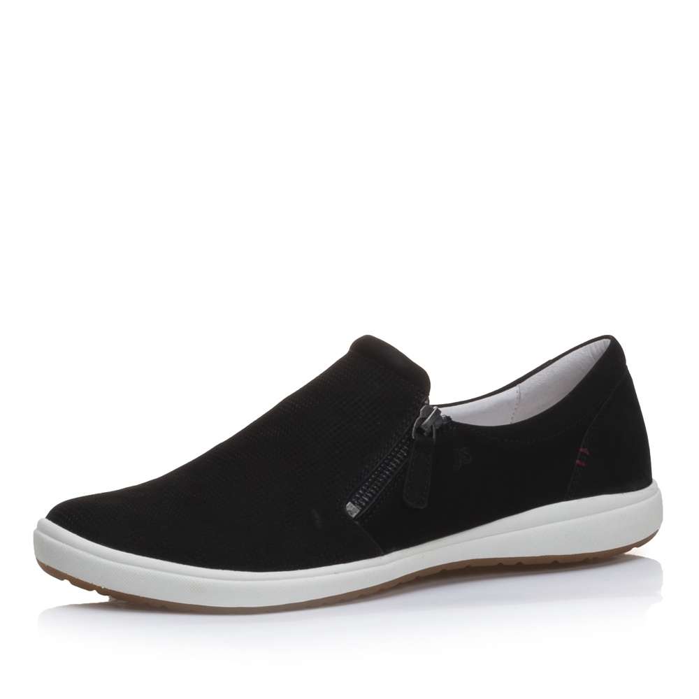 Černé dámské mokasíny značky Josef Seibel by neměly uniknout Vaší pozornosti. Svršek z pravé broušené kůže je decentně zdoben puntíky. Pro snadné nazouvání slouží funkční zip na vnější straně a pružná gumička na straně vnitřní. Tuto obuv si pohodlně můžete obout jak s kalhotami, tak sukní.