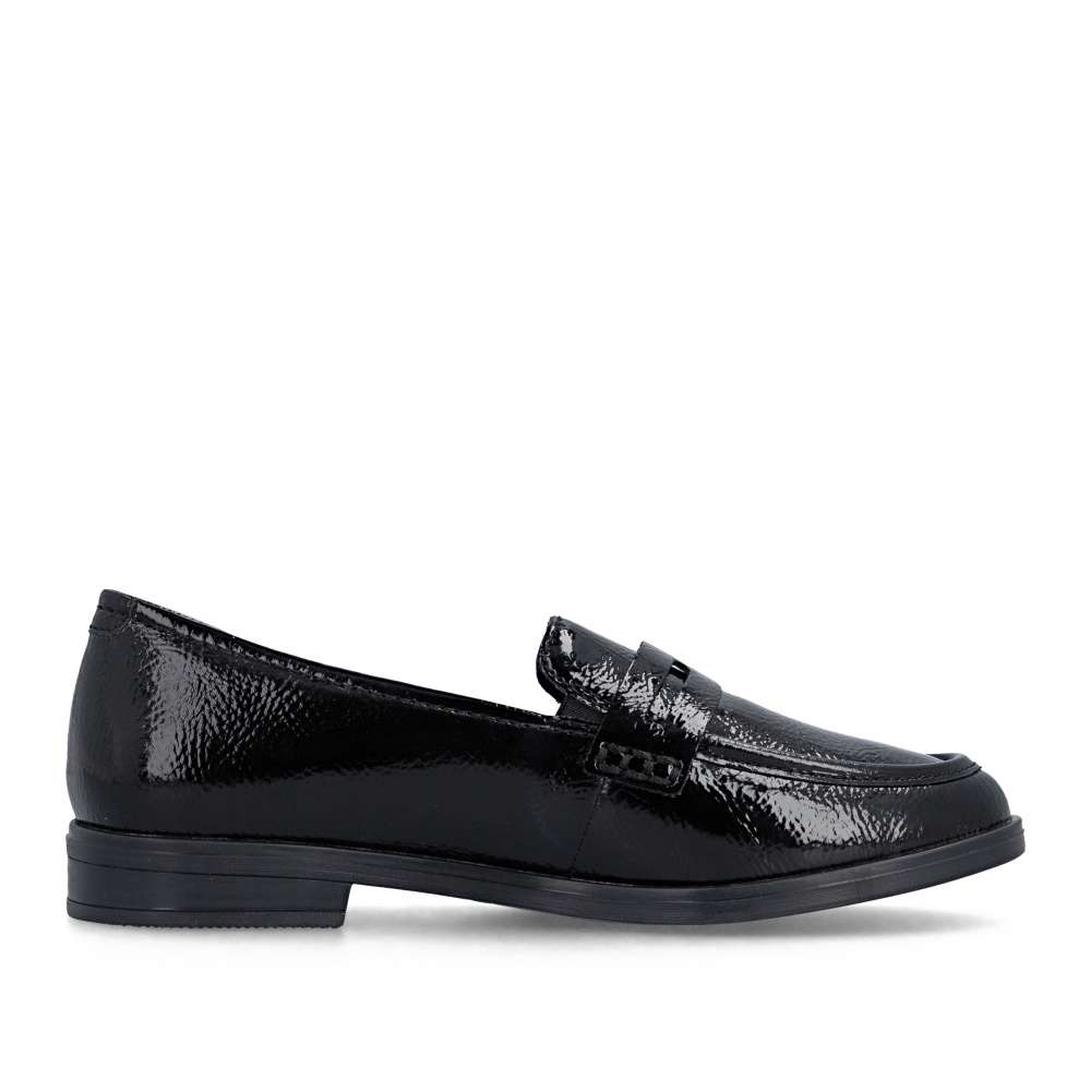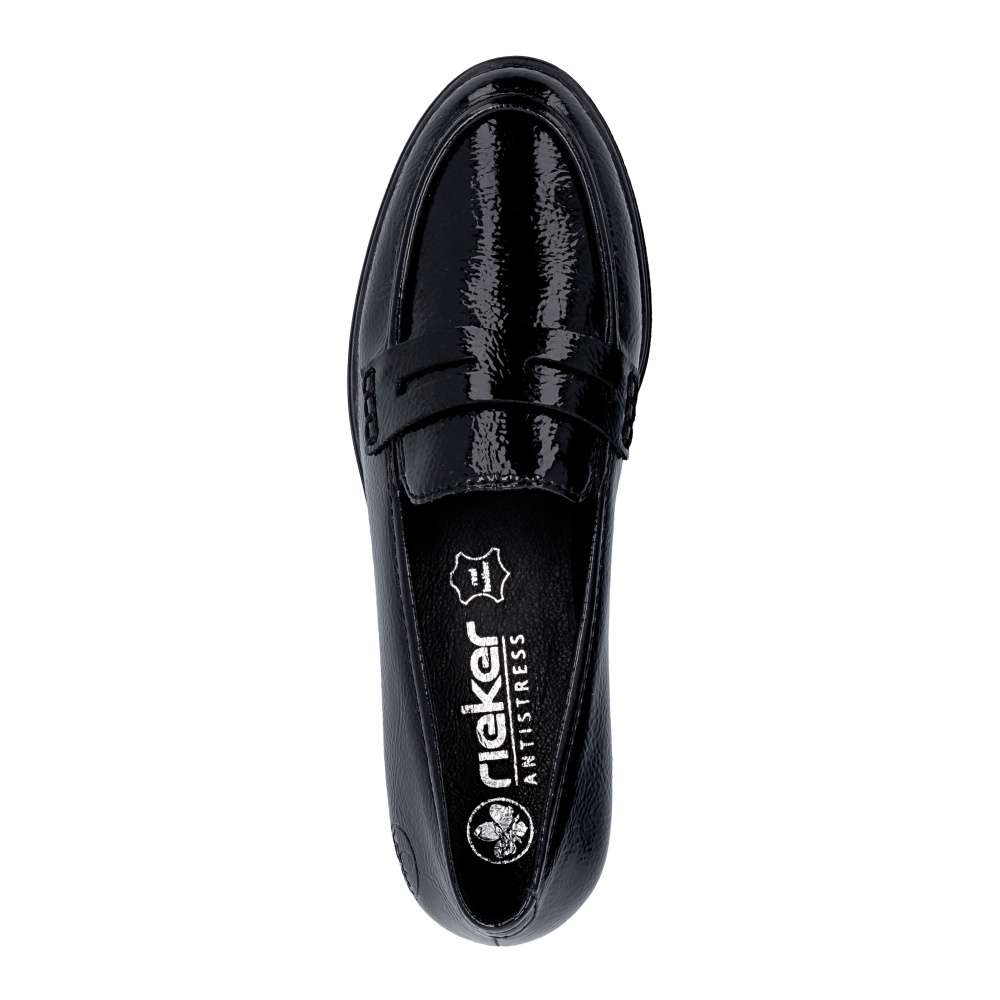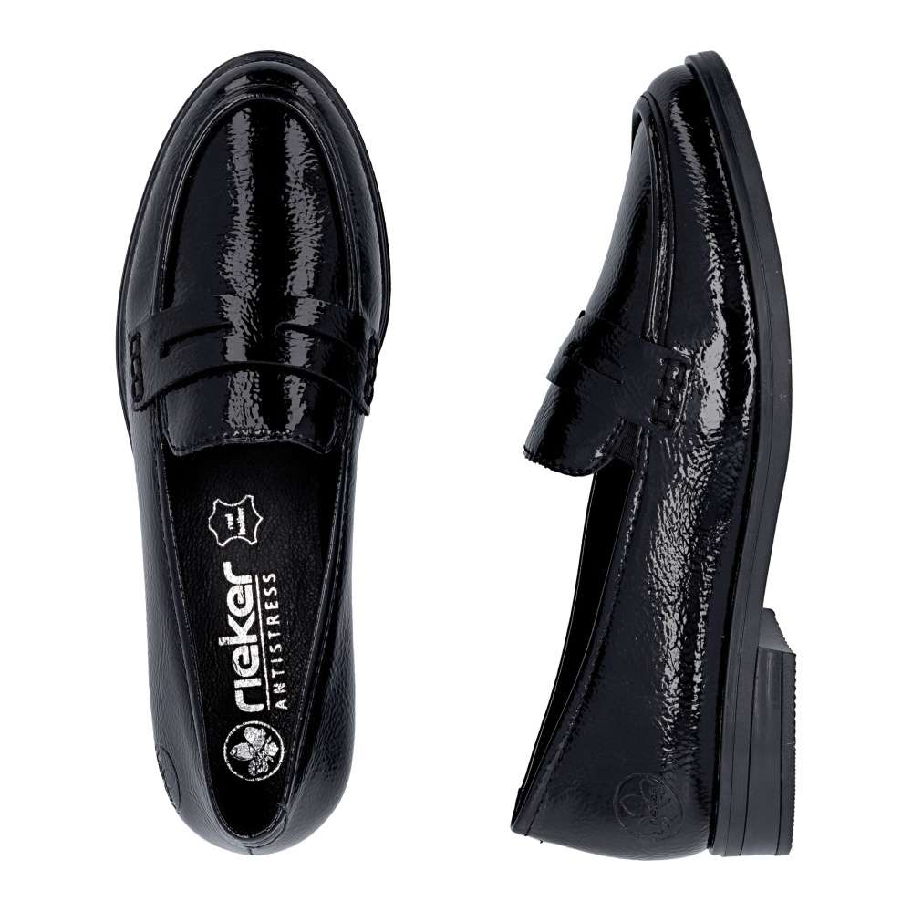 Tyto mokasíny RIEKER v klasické černé barvě zaujmou již na první pohled svým lesklým svrškem a nápaditou aplikací na nártu, která jim dodává šmrnc. Kožená stélka poskytuje příjemný komfort během celého dne a flexibilní podešev se postará o snadný krok. Díky jednoduchému nazouvání se stanou vaším oblíbeným společníkem pro každodenní nošení. Stačí je obout a s elegancí vykročit do nového dne. Technologie: Antistress – díky čtyřem antistresovým vlastnostem – lehkosti, pružnosti, prostornosti a vynikající absorpci nárazů – vám boty RIEKER nabídnou komfortnější chůzi.