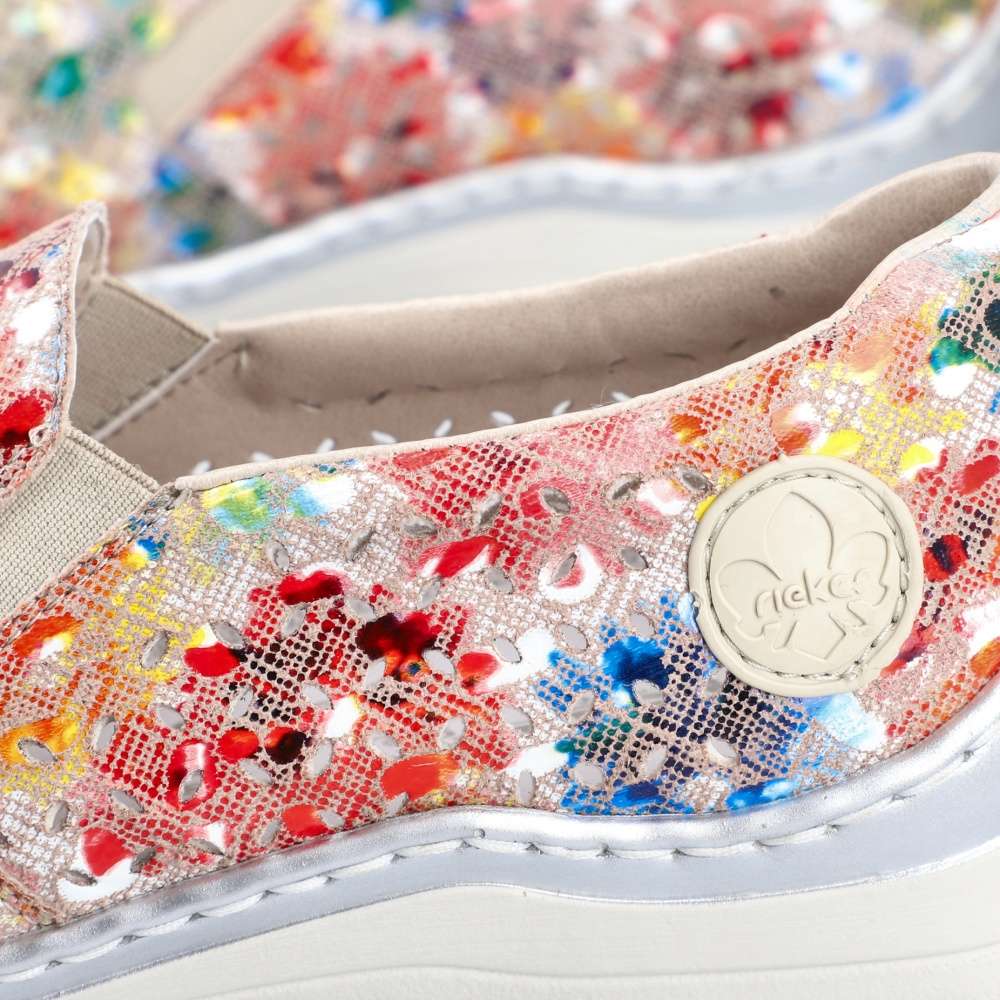 Jedinečné boty Rieker okouzlí vzhledem a maximálním pohodlím díky šířce H určené pro široké chodidlo. Barevný svršek je perforován pro pocit pohodlí i v teplých dnech, který je doplněn gumičkami na nártu pro jednodušší obutí. Nemůžeme opomenout flexibilní podešev a měkkou stélku, tyto bonusy oceníte na každé Vaší cestě. Technologie: Antistress – podešev je díky této technologii lehká, flexibilní, absorbuje nárazy při došlapu a snadno se přizpůsobí každé noze. Extraweit – obuv s tímto označením má stélku boty určenou pro široké chodidlo.