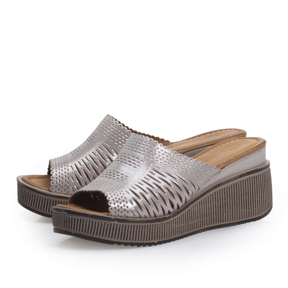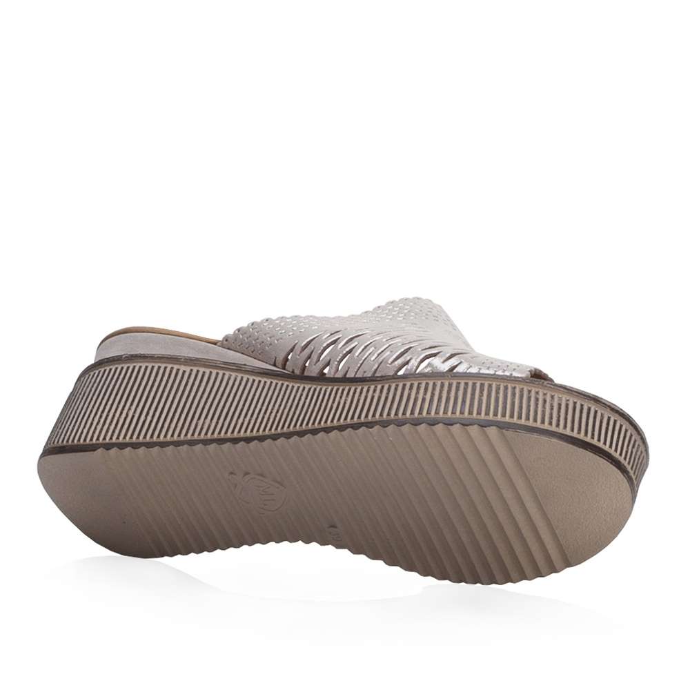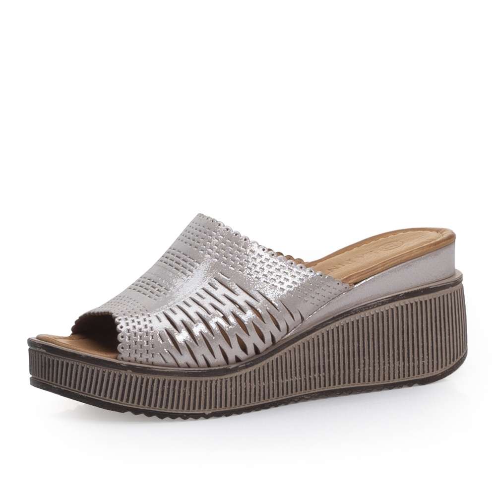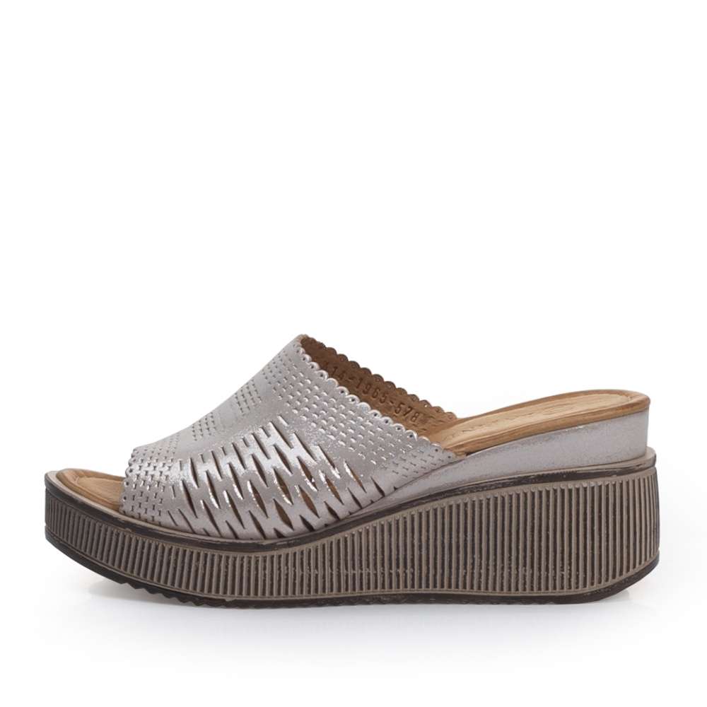 Široký stříbrný pásek přes nárt je perforován zajímavým vzorem.