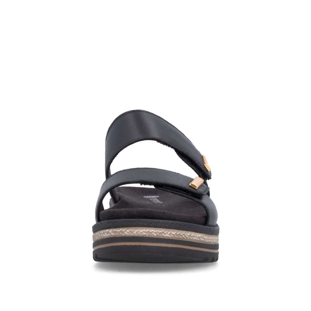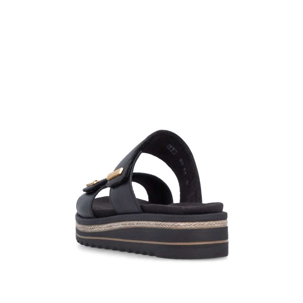 Obuv REMONTE představuje prémiovou řadu značky RIEKER, která se vyznačuje vysokou kvalitou použitých materiálů a precizním zpracováním. Tyto dámské nazouváky představují dokonalé spojení elegantního designu, lehkosti a pohodlí, které ocení každá žena během teplých letních dnů. Jejich kožený svršek univerzální černé barvy vytváří harmonický celek, zatímco zlaté aplikace na řemíncích dodávají modelu decentní vizuální půvab. Pro vaše maximální pohodlí jsou nazouváky vybaveny praktickými nastavitelnými pásky na suchý zip, které umožňují dokonalé přizpůsobení tvaru chodidla. Vyjímatelná stélka v textilním provedení poskytuje výjimečný komfort a vyšší podešev s jemným profilem zajišťuje bezpečný krok a zároveň svým propracovaným designem dotváří atraktivitu vzhledu. Tento model nazouváků vynikne v kombinaci se šaty, sukní i elegantními kalhotami – jednoduše boty, které vám dodají jistotu, styl a ženskost v každém kroku.