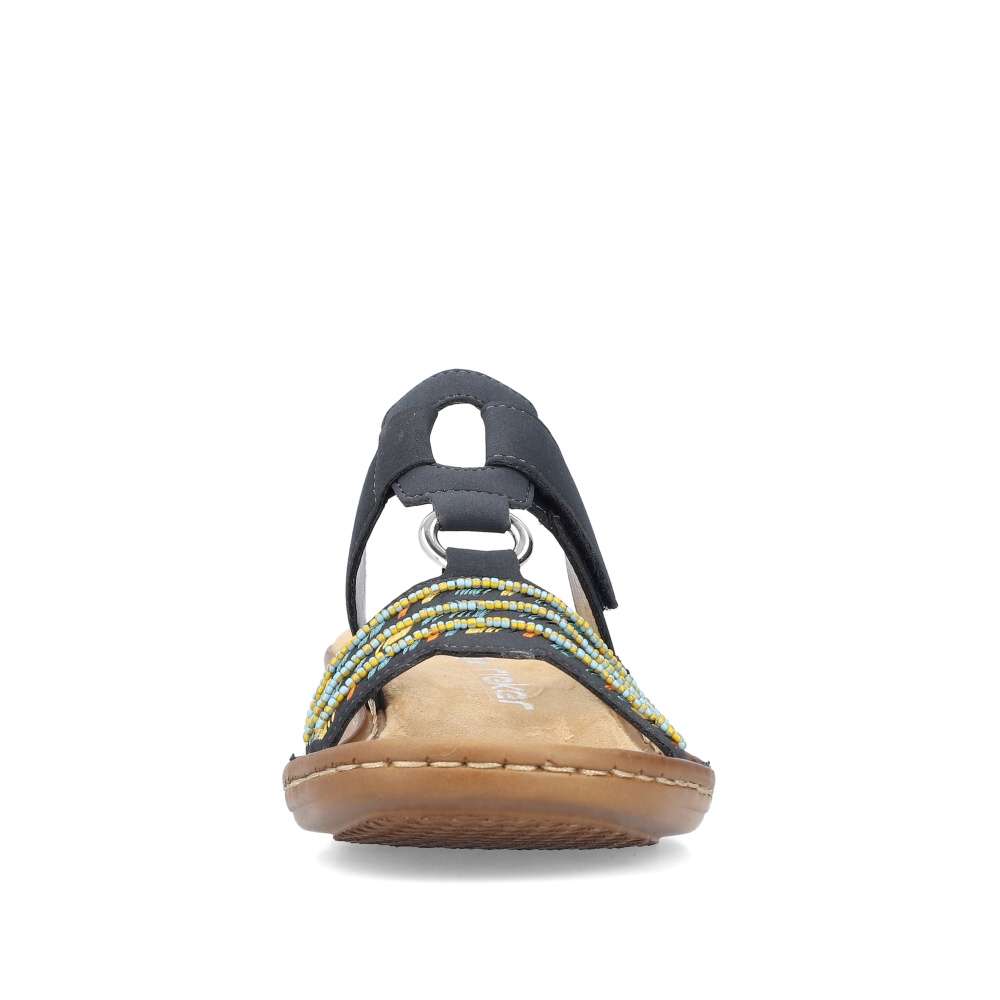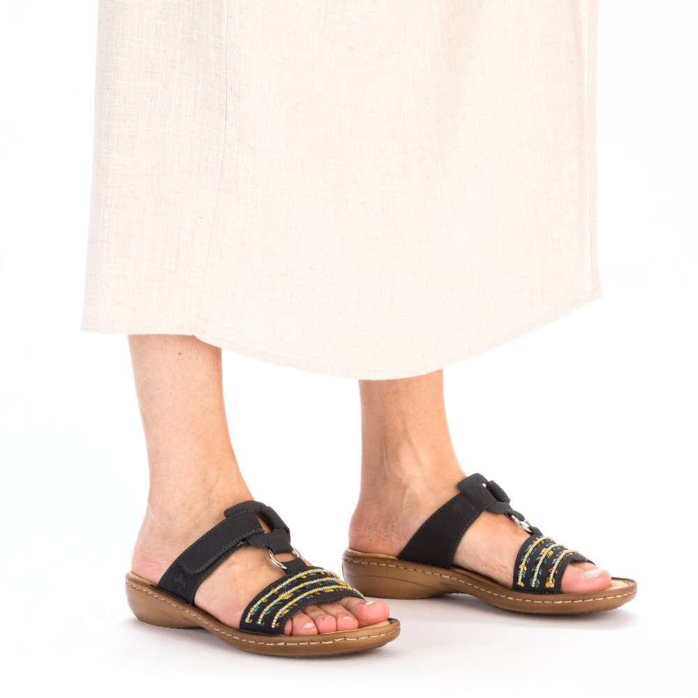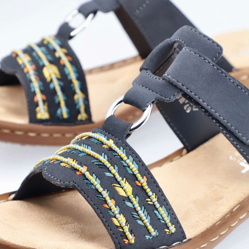 Letní dámské pantofle značky RIEKER, se kterými můžete zářit každý den. Tmavý svršek je zdoben barevným vzorem, který působí jemným dojmem, ale zároveň botičky oživí. Jemná podšívka a pohodlná stélka jsou z kvalitního materiálu a nemusíte se bát, že v obuvi nevydržíte celý den. Pro upevnění chodidla slouží suchý zip a vytvoří dokonalé pohodlí každým krokem. Technologie: Antistress – podešev je díky této technologii lehká, flexibilní, absorbuje nárazy při došlapu a snadno se přizpůsobí každé noze.