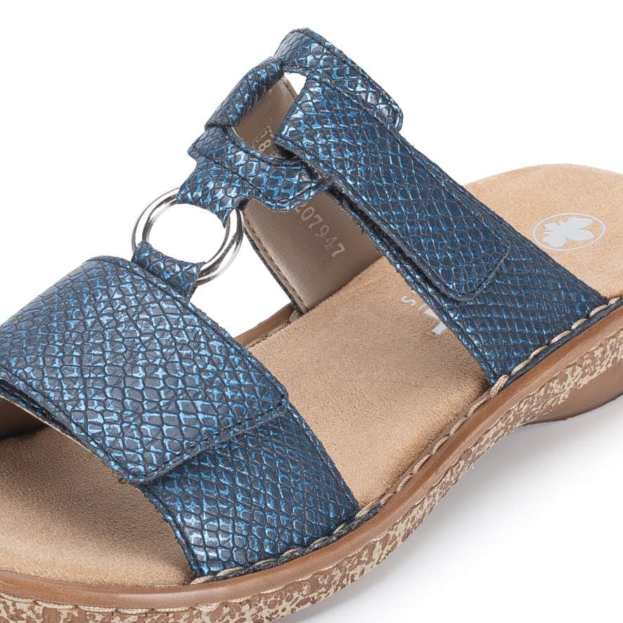 Unikátní model nazouváků značky RIEKER nesmí chybět ve Vašem botníku. Svršek tmavě modré barvy je ozdoben lesklým hadím vzorem a stříbrnou aplikací na nártu. Oba pásky jsou vybaveny suchým zipem, tedy si obuv můžete pohodlně nastavit dle svých požadavků. Měkká stélka je vyrobena z příjemného materiálu a podešev svou kontrastní barvou a prošitím, které je pro tuto značku typické, doladí celkový vzhled obuvi. Tento model zaručeně skvěle podtrhne Vaše letní outfity.
