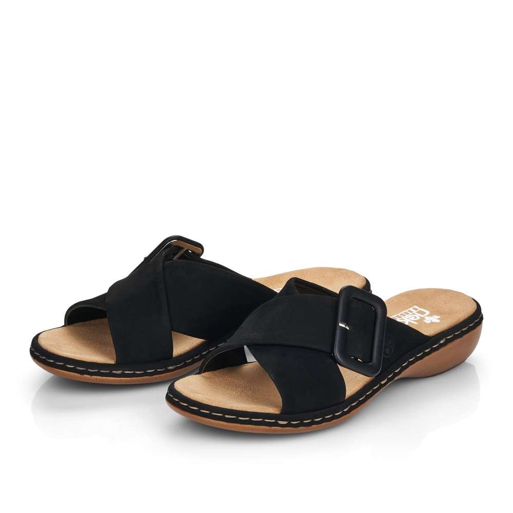 Detailní informace Tento model dámských nazouváků značky RIEKER bude tou správnou volbou. Širší černé pásky z pravé kůže jsou zdobné velikou sponou a překřížením. Měkká stélka je vyrobena z příjemného materiálu a podešev svým lemováním doladí obuv k dokonalosti. Nazouváky budou krásným doplňkem k sukni nebo šatům.